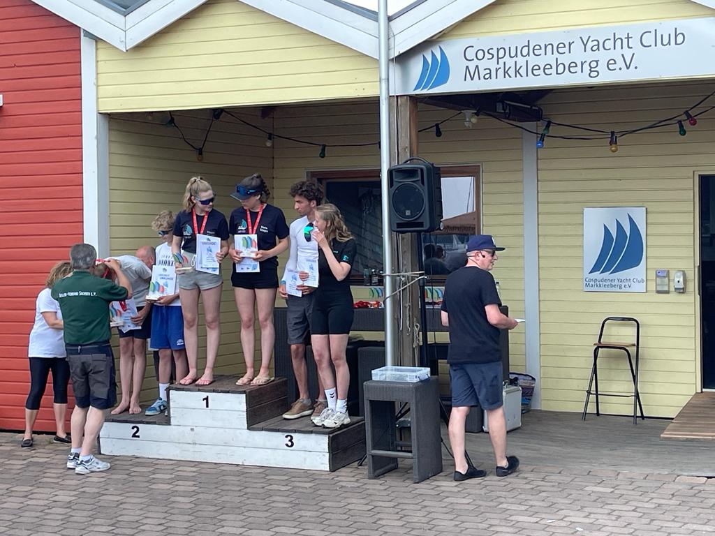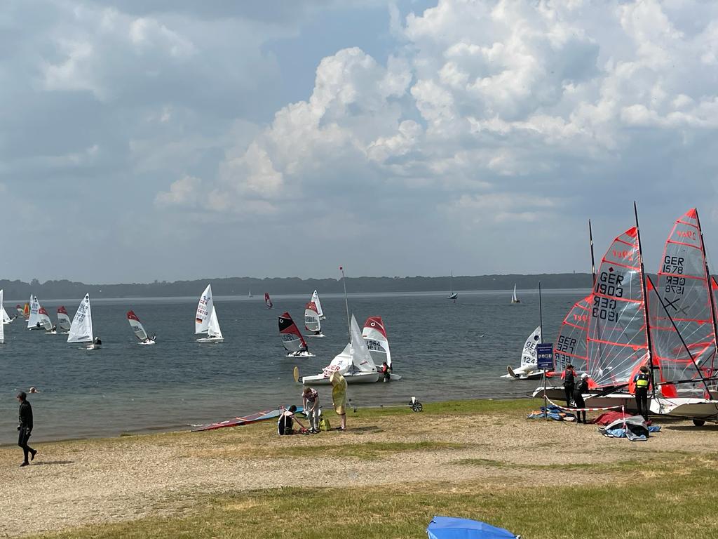 Somit fuhren wir am Freitag nach Leipzig an den Cospudener See. Das Feld war sehr durchmischt. Am ersten Tag konnten ebenfalls mangels Wind nur 2 Wettfahrten stattfinden. Wir ersegelten uns einen 3. Platz und einen 5. Platz. Die dritte Wettfahrt am Samstag lief gut für uns, musste aber abgebrochen werden, da uns eine Gewitterfront erreichte. Innerhalb von 5 Minuten wurden alle Segler vom Wasser geholt. Es war beeindruckend, wie gut die Organisation und Unterstützung funktioniert hat. Alle Boote konnten vor dem Eintreffen der Gewitterfront vom Wasser geholt werden und unbeschadet ihre Boote abriggen. Am zweiten Wettfahrtag wir einen 3. und 2. Platz gesegelt, der uns insgesamt einen 3. Platz in der Gesamtwertung ermöglichte.