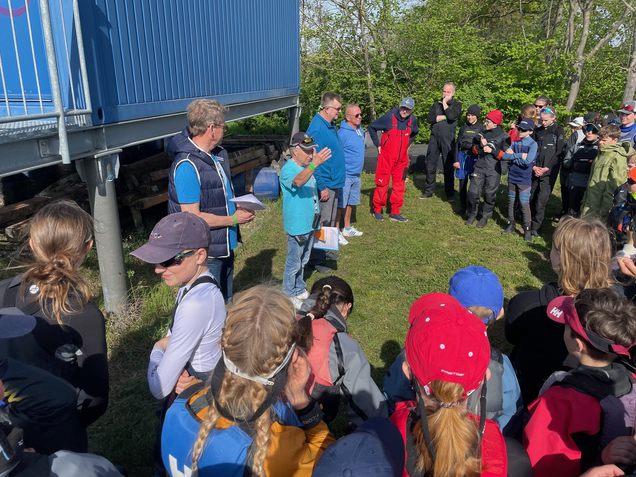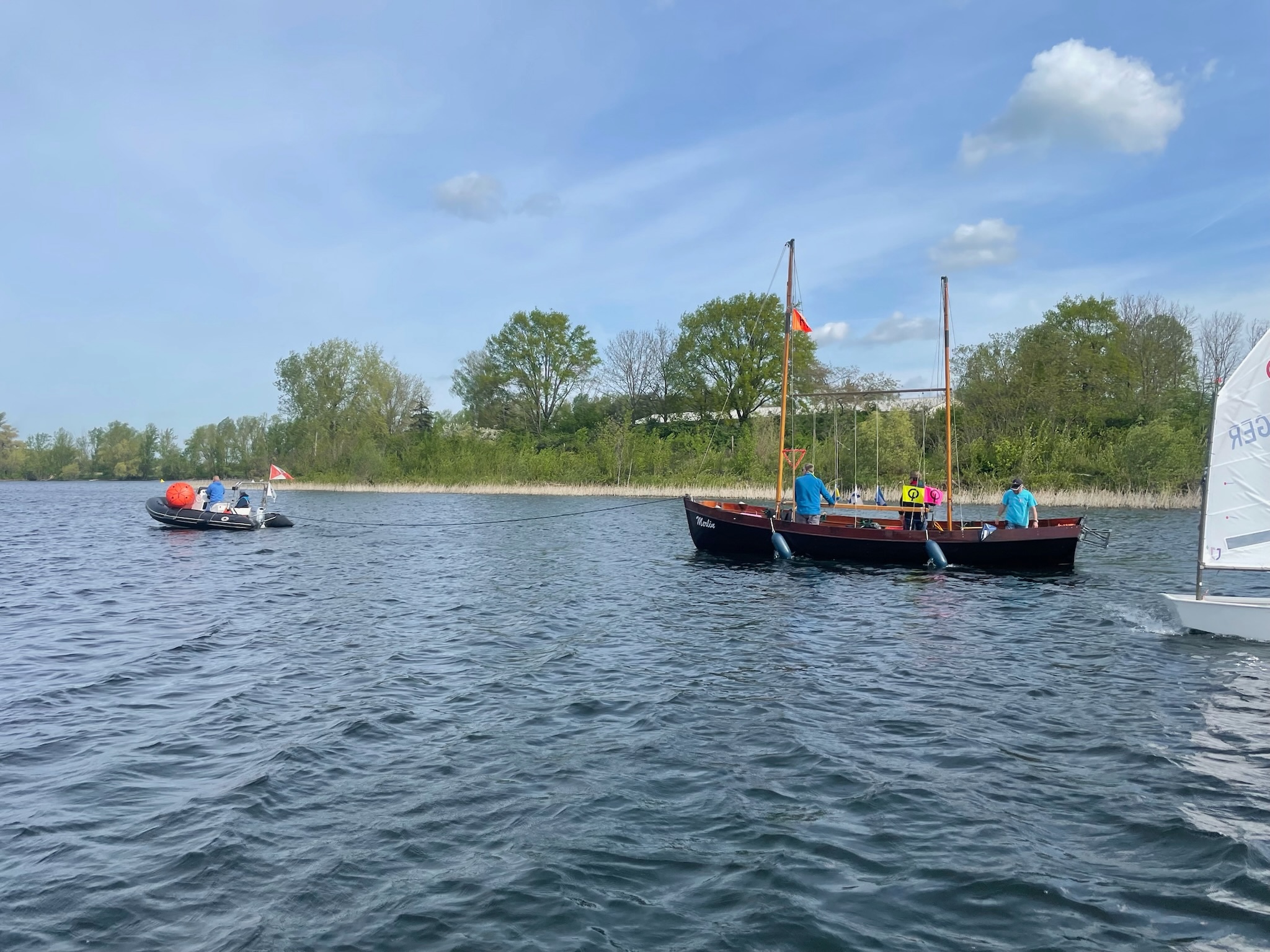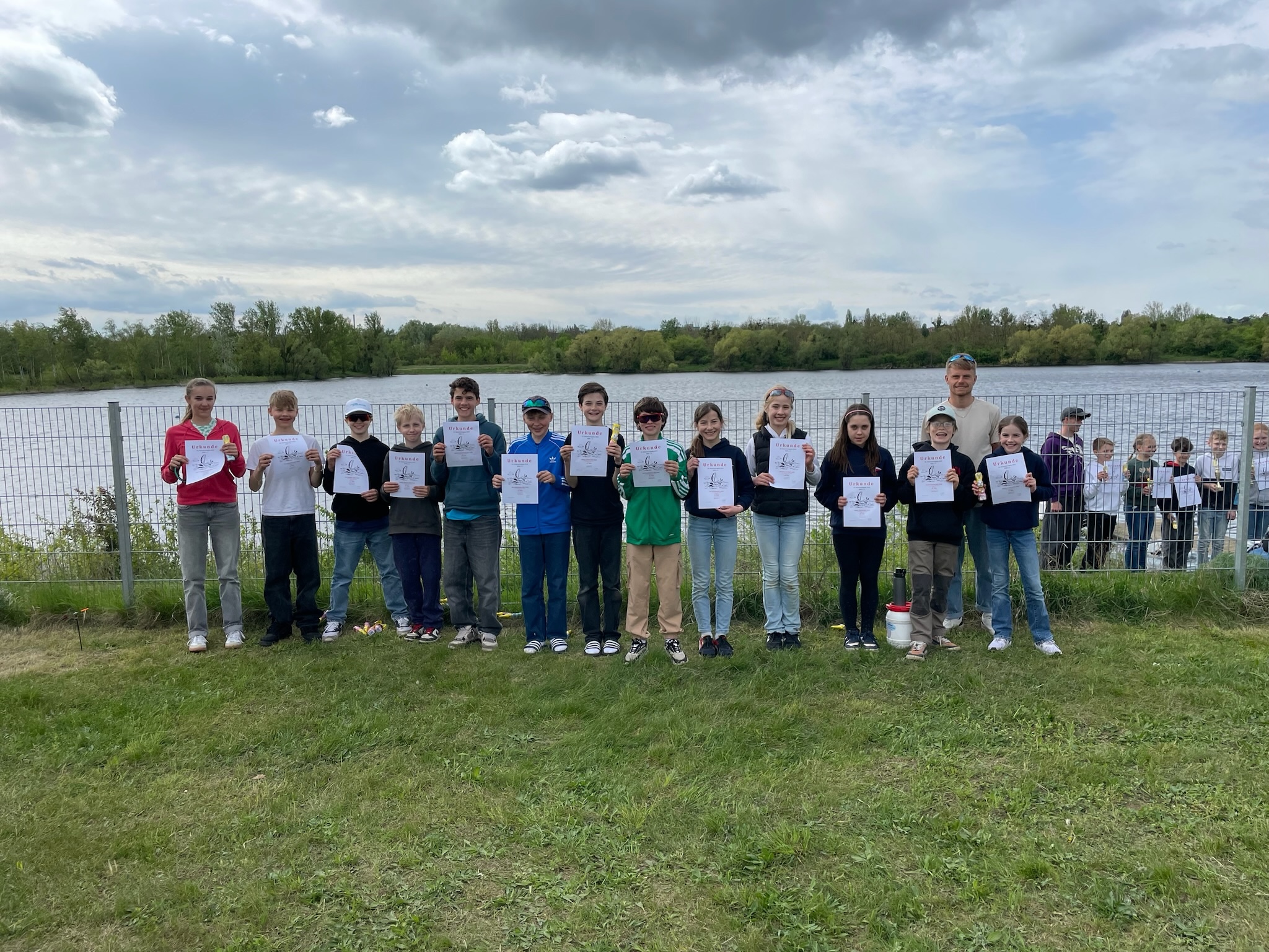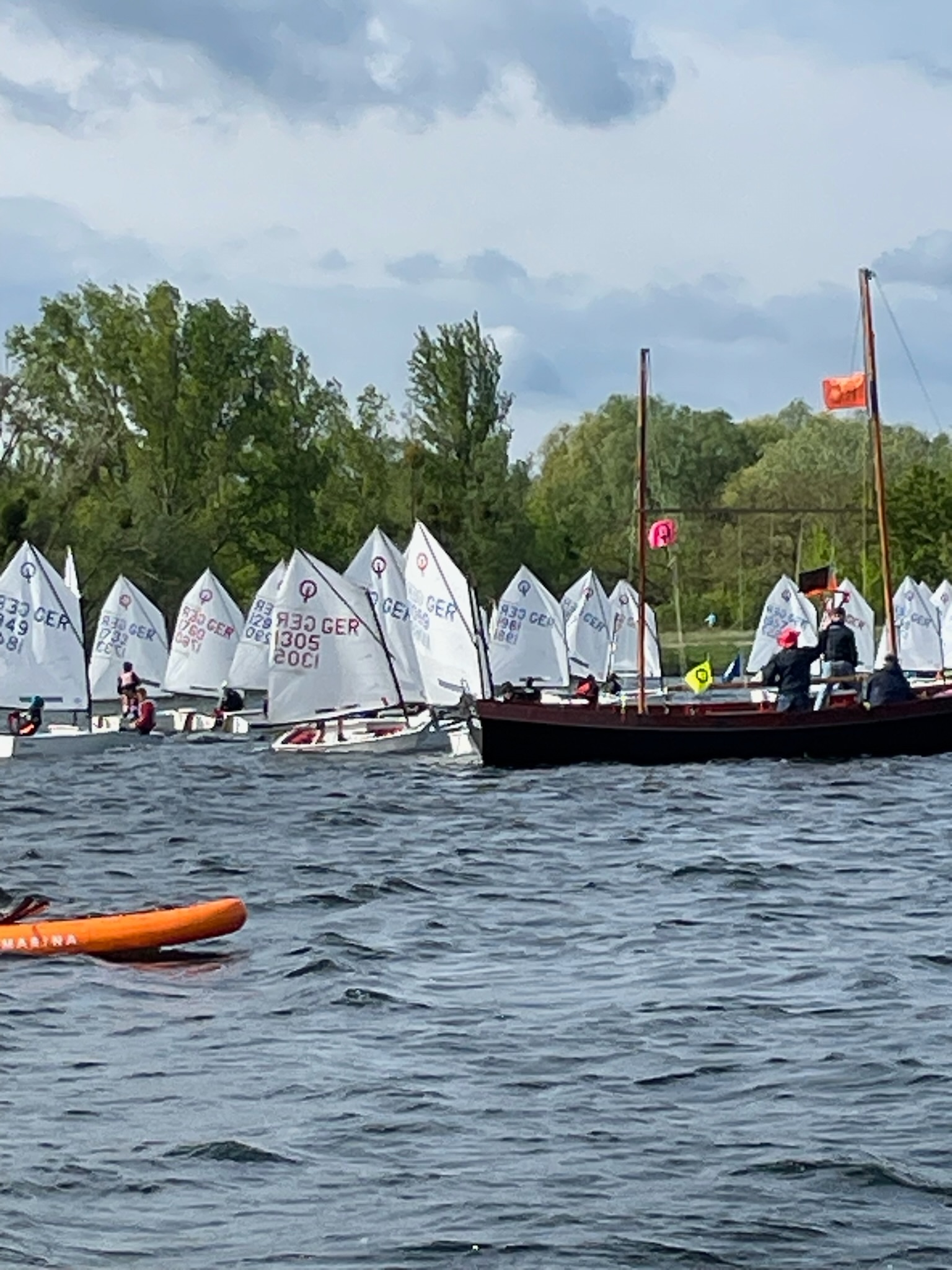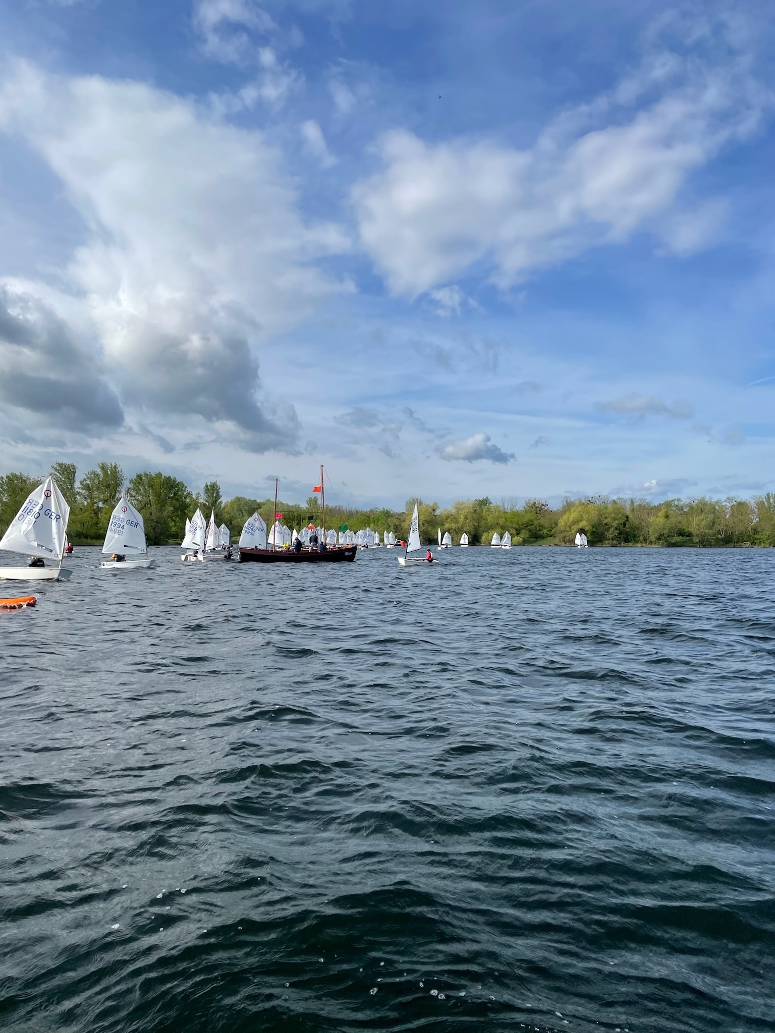 Am Samstag morgen war dann um 11:25 Uhr der erste Start. Wir sind dann vier Wettfahrten gesegelt, nach der ersten Wettfahrt gab’s an Land ein gemeinsames Mittagessen. Nach dem Essen fuhren wir noch drei weitere Wettfahrten. Am Abend waren wir alle zusammen mit unserem Trainer Johannes und in der Stadt in einer Pizzeria essen. Da der See (Salbker See II - erst 1973 auf Grund von Kiesabbau entstanden) so klein ist, konnte die Wettfahrtleitung die Tonnen über Nacht draußen gelassen. Am Sonntag war dann bereits um 9:55 Uhr das Ankündigungssignal. Der Wind kam so, dass wir die Tonnen Steuerbord runden mussten. Wir fuhren dann nur noch ein Wertungsrennen. Anschließend segelten alle A und B (insgesamt 55) zusammen ein Spaß-Rennen. Die Jury (Schiris und Tonnenleger) warfen rote Beutel ins Wasser, die wir einsammeln durften. Darin war für jedes Kind ein Turnbeutel. Nachdem jeder Opti seinen Überraschung geangelt hatte, verluden wir die Boote und danach war die Siegerehrung. Hugo war der beste Segler aus dem PYC auf dem 8. Platz.