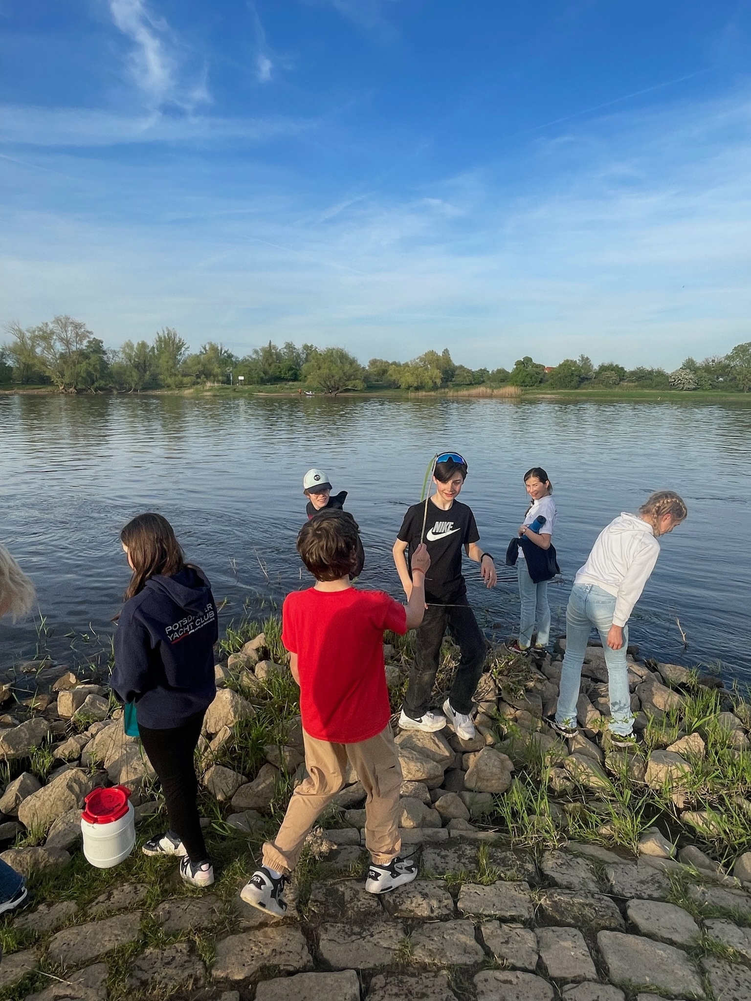 Am Freitag um 17 Uhr fuhren wir mit 13 Opti-As gemeinsam im Verein-Bus nach Magdeburg. Nachdem wir dort ankamen, haben wir erst mal in der Jugendherberge zu Abend gegessen (das Essen war verbesserungswürdig) und sind dann anschließend noch zum WBF gefahren, um dort die Boote abzuladen und uns anschließend noch anzumelden.