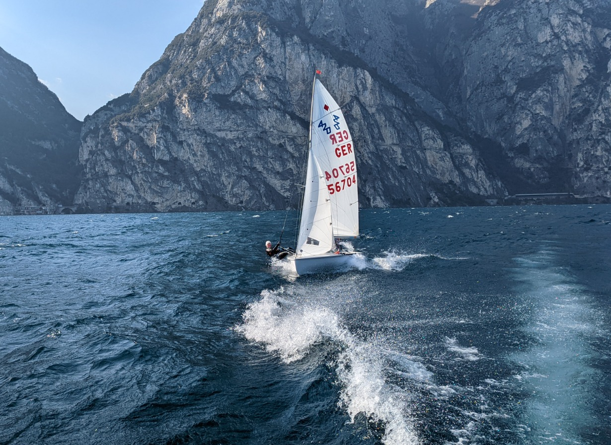 Für die meisten unserer PYC 420er hat die Saison dieses Jahr schon Anfang März am Gardasee gestartet. Den schulfreien Frauentag und Brückentag in Berlin haben wir uns direkt zunutze gemacht und sind für ein kurzes aber effektives Training von 3 ½ Tagen an den Gardasee gefahren. Dort hatten wir zwei kleine Wohnungen. In der einen haben wir mit allen drei Teams zu sechst gewohnt, die andere haben wir unserer Trainerin Annika und Paco überlassen. Nach einer kleinen Panne des Motorboots mussten wir uns spontan vor Ort eines leihen, dann sind wir aber auch direkt mit viel Wind und schönem Sonnenschein aufs Wasser gegangen. Nach der doch schon etwas längeren Winterpause mussten wir uns erstmal wieder einsegeln, was die kalten Temperaturen nicht direkt erleichtert haben. Wir konnten eine Einheit deshalb leider nie länger als drei Stunden machen.