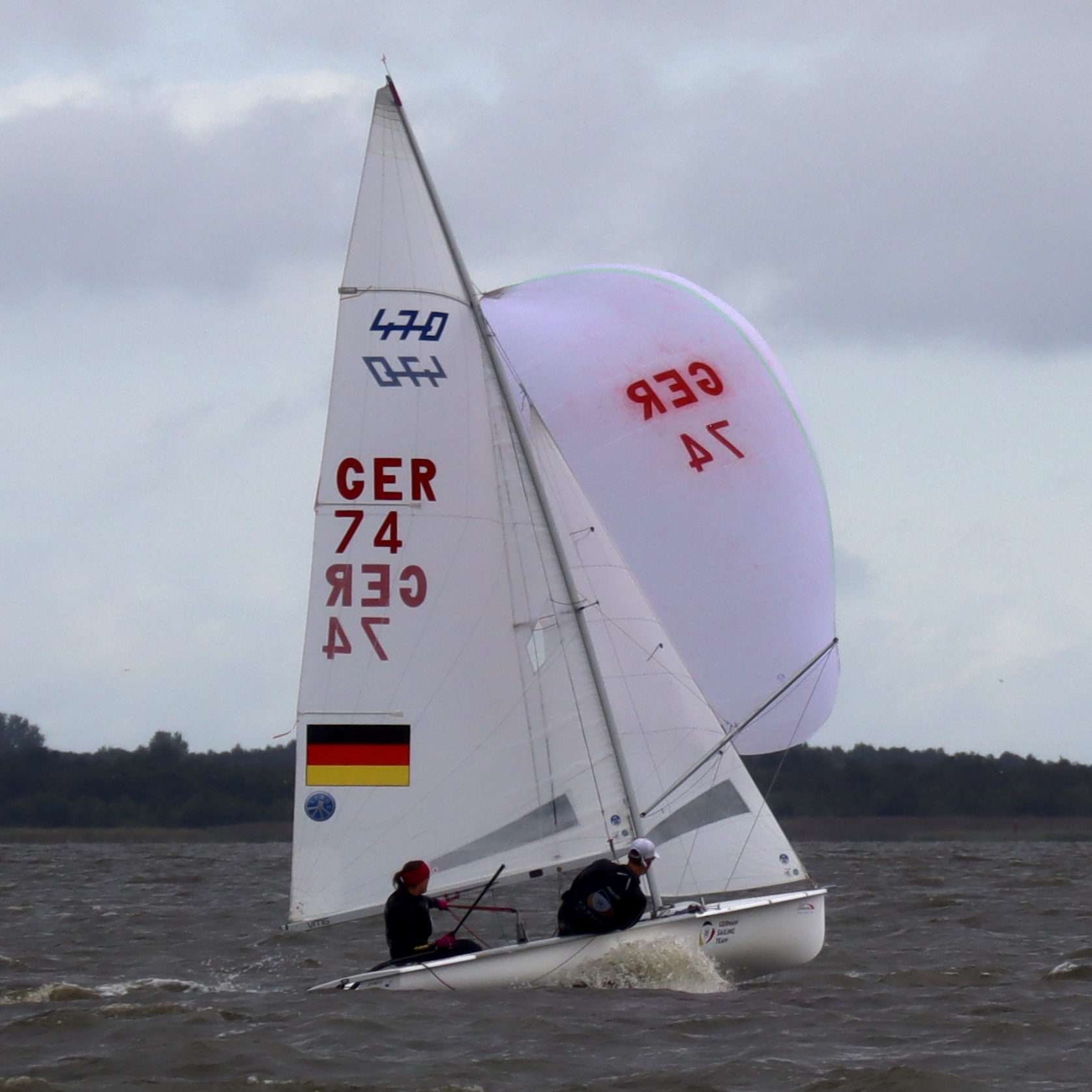 Am nächsten Tag war 12 Uhr Start. Zusammen mit den Junioren und den anderen Teilnehmern der Kehraus Regatta segelten wir bei Wind zwischen 20-25kn um die Wette. Zwei Rennen sind wir gefahren, in denen wir uns 2 zweite Plätze ersegelten. Danach hatte der Wind noch bis über 30kn zugenommen. So kenterten wir zwischen dem zweiten und dritten Rennen, wobei unser Mast leider ziemlich verbogen ist. Das Steinhuder Meer ist nämlich zwar ein gutes Segelrevier, jedoch ist der Wasserstand extrem niedrig.
