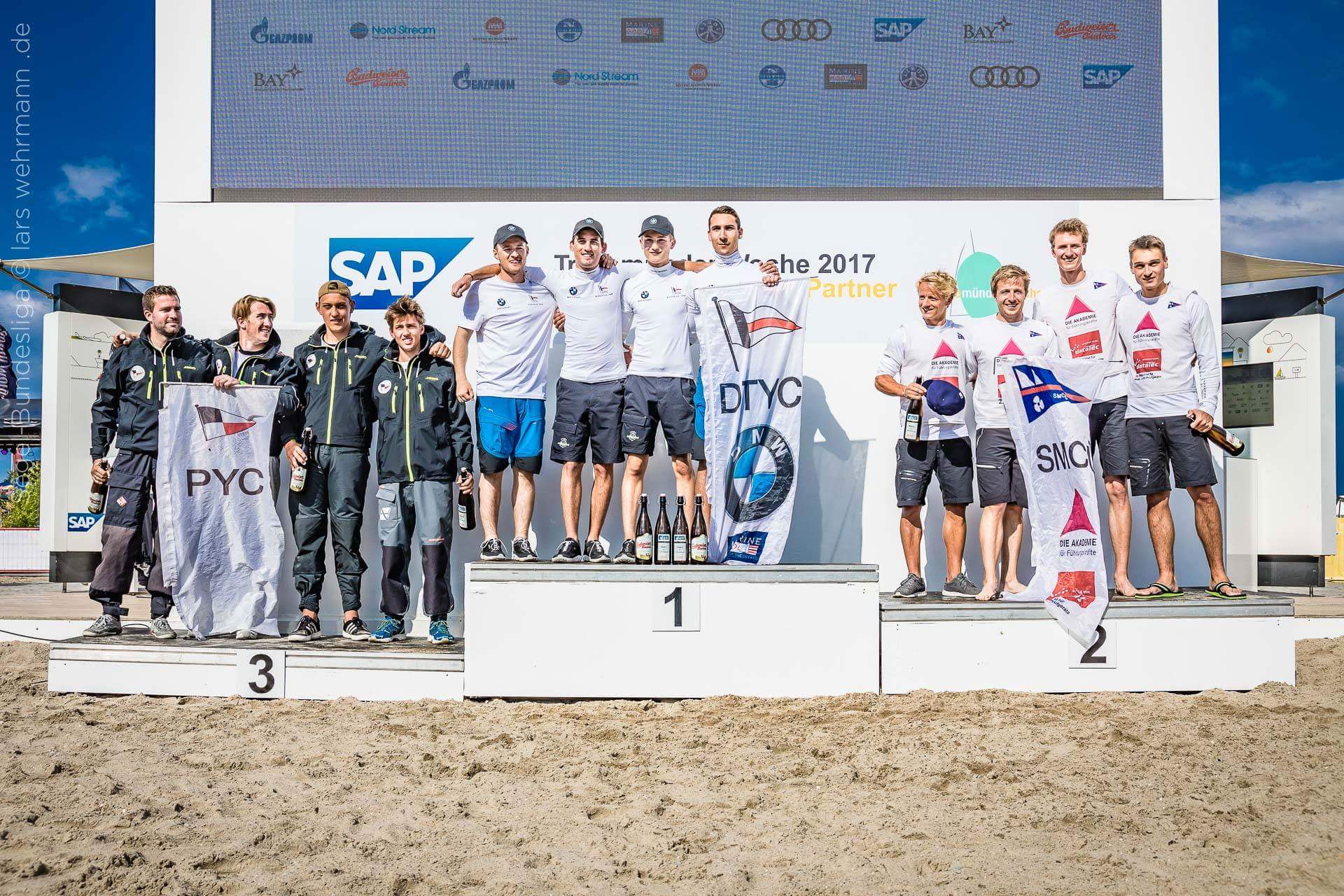 Am Freitag die ersten fünf Rennen. Das PYC Team kann den ersten Renntag nach langen Unterbrechungen aufgrund fehlenden Windes gegen 21h mit zwei Siegen und damit auf Rang 3 beenden. Der Samstag startet verheißungsvoll. Nach einem Fehlstart von 4 Booten hat sich unser Boot als eines von zweien bereinigt und geht als letztes Boot in das Rennen. Durch couragierte Manöver und die Wahl der richtigen Seite steht im ersten Rennen ein dritter Platz. Weitere gute Plätze und auch ein Interview mit Freddie auf dem Medienmotorboot folgen, das allerdings fast dazu führt, dass das Team zu spät zum Start der letzten Tageswettfahrt kommt. Dramatik pur. Guter Start aber am Luvfass wird es eng. Das Team kassiert berechtigterweise einen Strafkringel und fällt dadurch auf den dritten Platz zurück. Pech dann bei einem Manöver, bei dem ein anderes Boot leicht touchiert wird und erneut ein Strafkringel fällig ist. Somit ist das Rennen gelaufen und es springt nicht mehr als der letzte Platz heraus. Aber auch die Konkurrenten lassen Federn. Nach insgesamt 11 Rennen steht am Samstag immer noch der 3. Platz in der Ergebnisliste mit lediglich 2 Punkten Abstand zum Führenden. Am Sonntag nun Spannung bis zum letzten Rennen. Die nach zwei Tagen führenden Hemelinger sacken bis ins Mittelfeld durch und auch das PYC Team startet durchwachsen in den Tag mit insgesamt 5 Rennen. Im letzten Durchlauf steuert Freddie das Team auf einen ungefährdeten Start-Ziel-Sieg und damit kann es insgesamt nicht schlechter als Platz vier werden. Die Rupernhorner nehmen sich im folgenden Lauf mit einem Kringel selber aus dem Rennen um das Treppchen, so kommt es im abschließenden Lauf drauf an, wie die Überlinger abschneiden und damit, ob der PYC auf Platz zwei oder drei diesen Spieltag beendet. Letzter Vorwind für die Überlinger und den Berliner Yacht Club. Statt ohne Manöver ins Ziel zu fahren, macht der BYC noch eine Halse und lässt die Überlinger um 2 m durchrutschen, damit ist der PYC sensationell dritter an diesem Spieltag. Herzlichen Glückwunsch! Spieltagskapitän Martin Metzing: " Treppchen ist immer gut aber.... es bleibt spannend". Wir freuen uns auf die beiden kommenden Spieltage in Glücksburg und Berlin. Bis dahin steht der PYC weiterhin auf dem Gesamtzplatz 17 aber nun wieder in Schlagdistanz zum Mittelfeld.