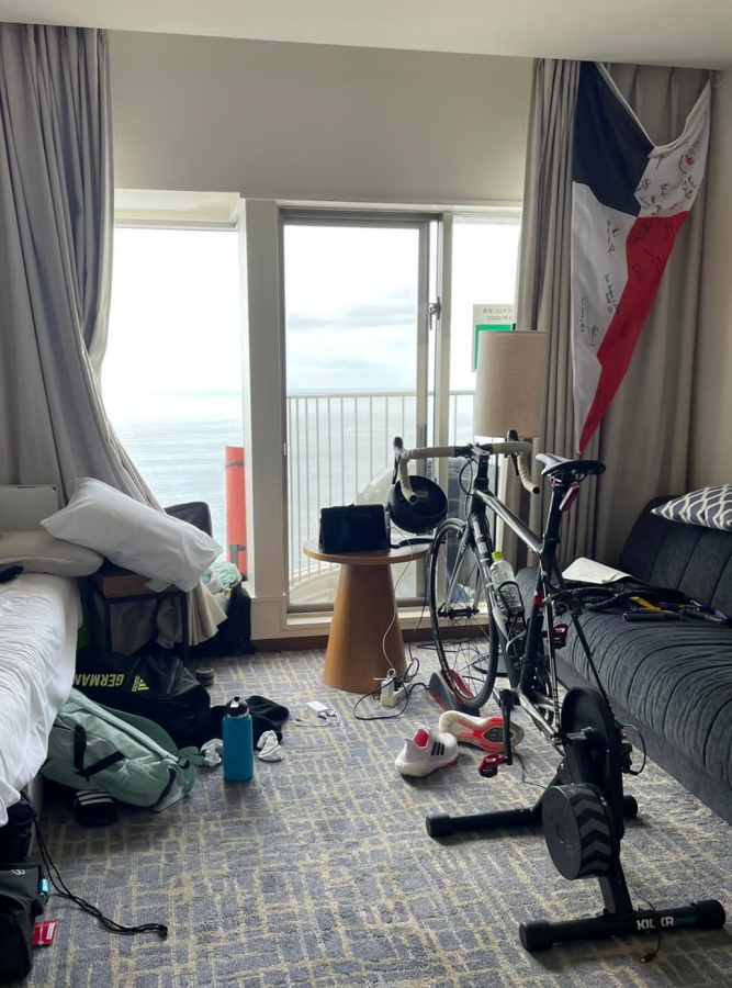 19.7. Der Jetlag ist gut überwunden, ich hatte die Zeitumstellung in Deutschland schon ein bisschen vorbereitet ... 3 Tage im Training hatten wir jetzt eher wenig Wind, gestern dann etwas mehr, mal richtig zum Hängen – ein traumhafter Segeltag. Heute machen wir dann Layday, morgen geht's mit Training weiter und am 21. ist dann schon Vermessung ... „