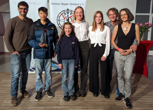 Wir gratulieren dieses Jahr unseren PYC-Seglerinnen und -Seglern (im Bild v.l.n.r.): Bernardo Low-Beer im ILCA 6, Johannes Schütz im Opti A, Lale Adomeit im Opti B, Gesa Papenthin im ILCA 6, Cosima Schlüter [und Finn Schäfer (BYCÜ)] im 470er, sowie Frank und Uta Thieme (BYC) im Korsar zu ihren erzielten Erfolgen.