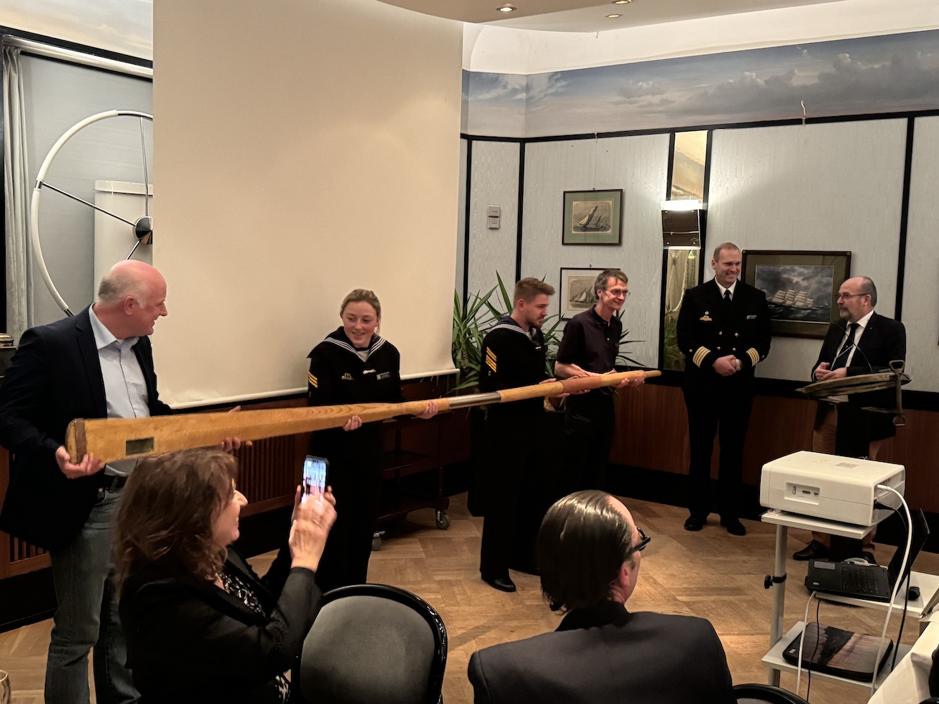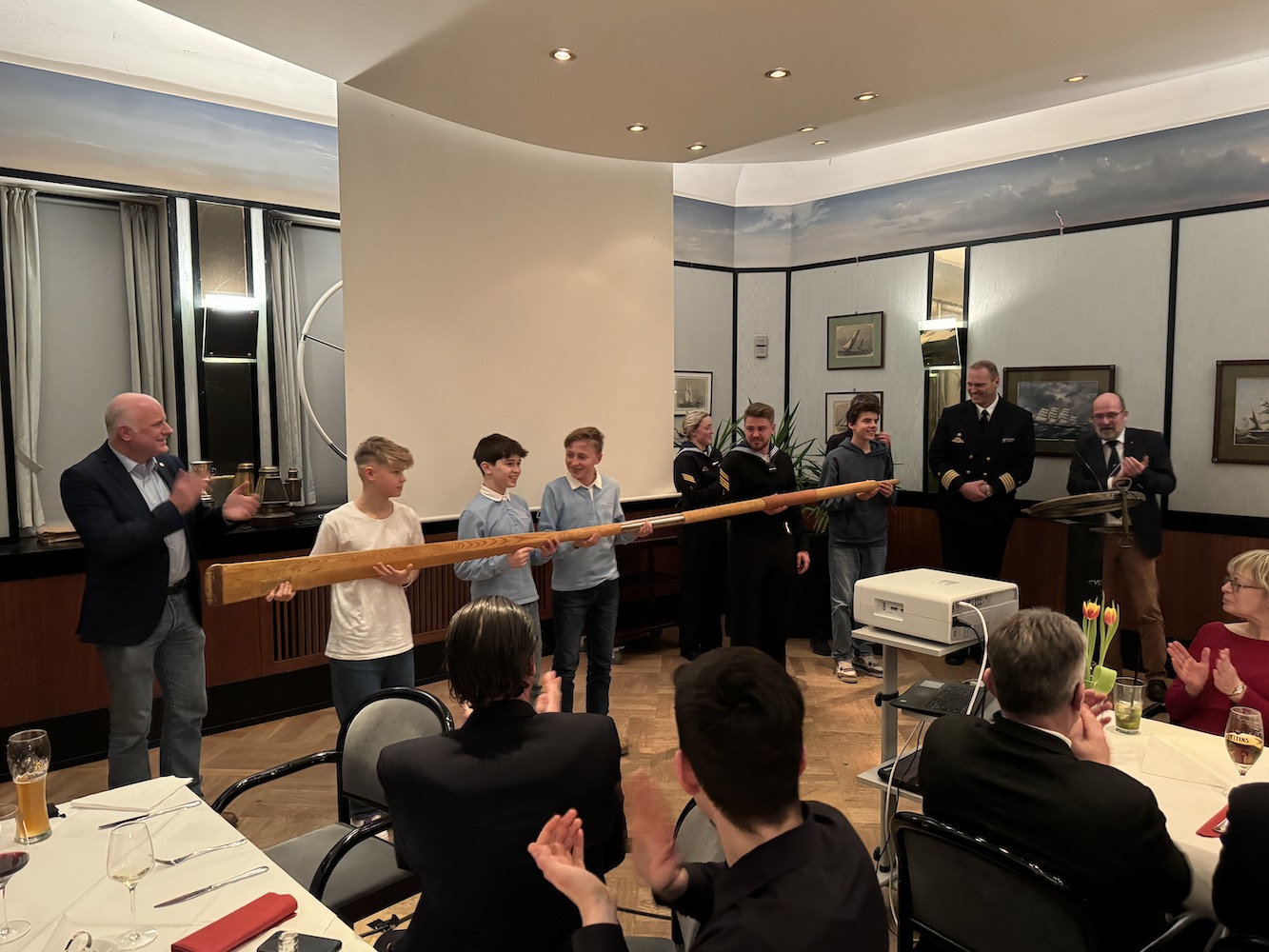 Der „langen, langen Tradition“ der Gastgeschenke folgend, überreichte KptzS von Kielmansegg dem PYC abschließend zum Zeichen der „langen, langen Verbundenheit“ einen „langen, langen Riemen“ von einem der Holzkutter, die früher als Beiboote der Gorch Fock dienten. „Noch bringen wir immer irgendetwas mit“, scherzte der Kommandant, „wenn die Zeiten schwieriger werden und die Ersatzteillage sich verschlechtert, dann holen wir uns das alles Stück für Stück wieder zurück!“