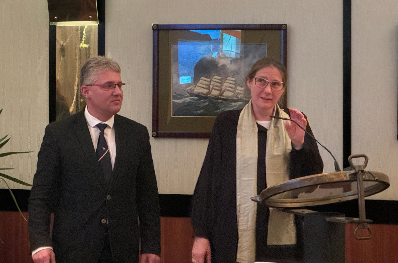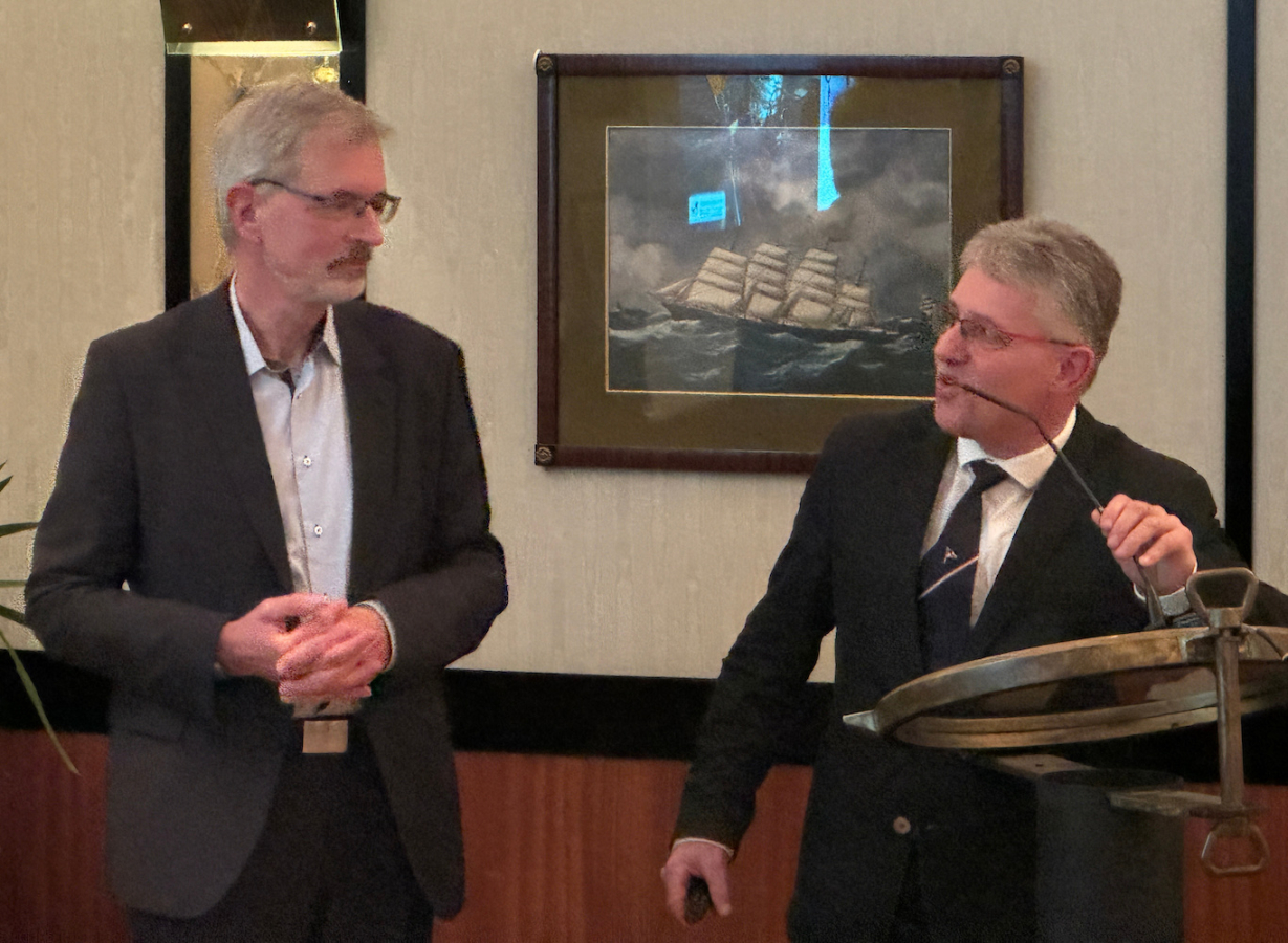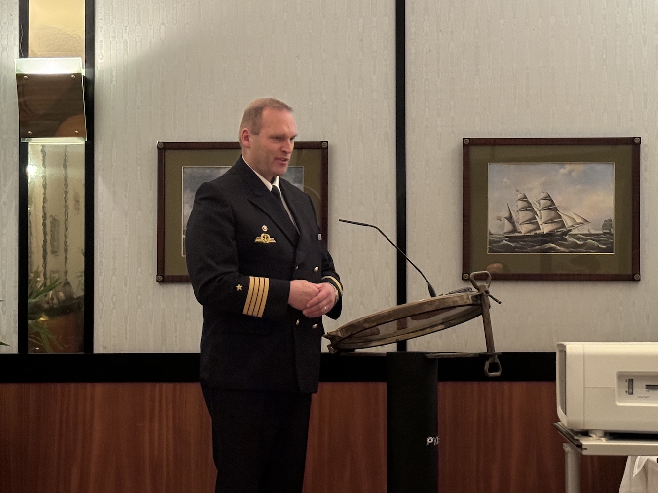 Einen überaus attraktiven Zwischengang, stellte die Rede des Kommandanten der Gorch Fock, KptzS Andreas-Peter Graf von Kielmansegg, dar. Der Kommandant hob den Wert dieser über lange Jahre gewachsenen Freundschaft, über Generationen, Dienstposten- und Ämterwechsel hinweg, hervor, der für die Besatzung der Gorch Fock besonders in den schwierigen Zeiten der Werft spürbar wurde. Die Hilfe und der Zuspruch, die durch den Potsdamer Yacht Club kamen, seien nicht vergessen. Er freue sich, so Graf von Kielmansegg, dass man nun ein bisschen etwas zurückgeben könne, indem im vergangenen Jahr Mitglieder des PYC an Bord begrüßt werden durften. Die Potsdamer, die mitgefahren sind, seien ihnen allen sehr willkommene Bordkameraden gewesen - die Großen wie die Kleinen. Ein solches Angebot hofft der Kommandant dem Club auch in diesem Jahr unterbreiten zu können, aller Voraussicht nach Anfang August im Zusammenhang mit einer Einladung des Segelschulschiffs zu einem Großseglertreffen nach Stettin und der anschließenden Weiterfahrt zur Hanse Sail nach Warnemünde bzw. der Heimreise zurück nach Kiel. [Martin Meyers Doku der Reise 2023 im PYC-YouTube-Channel bzw. s.u.]
