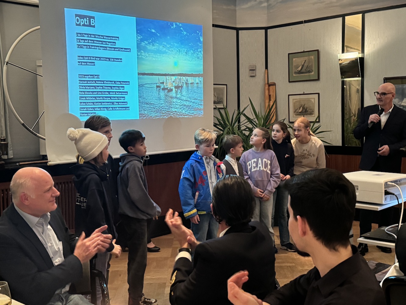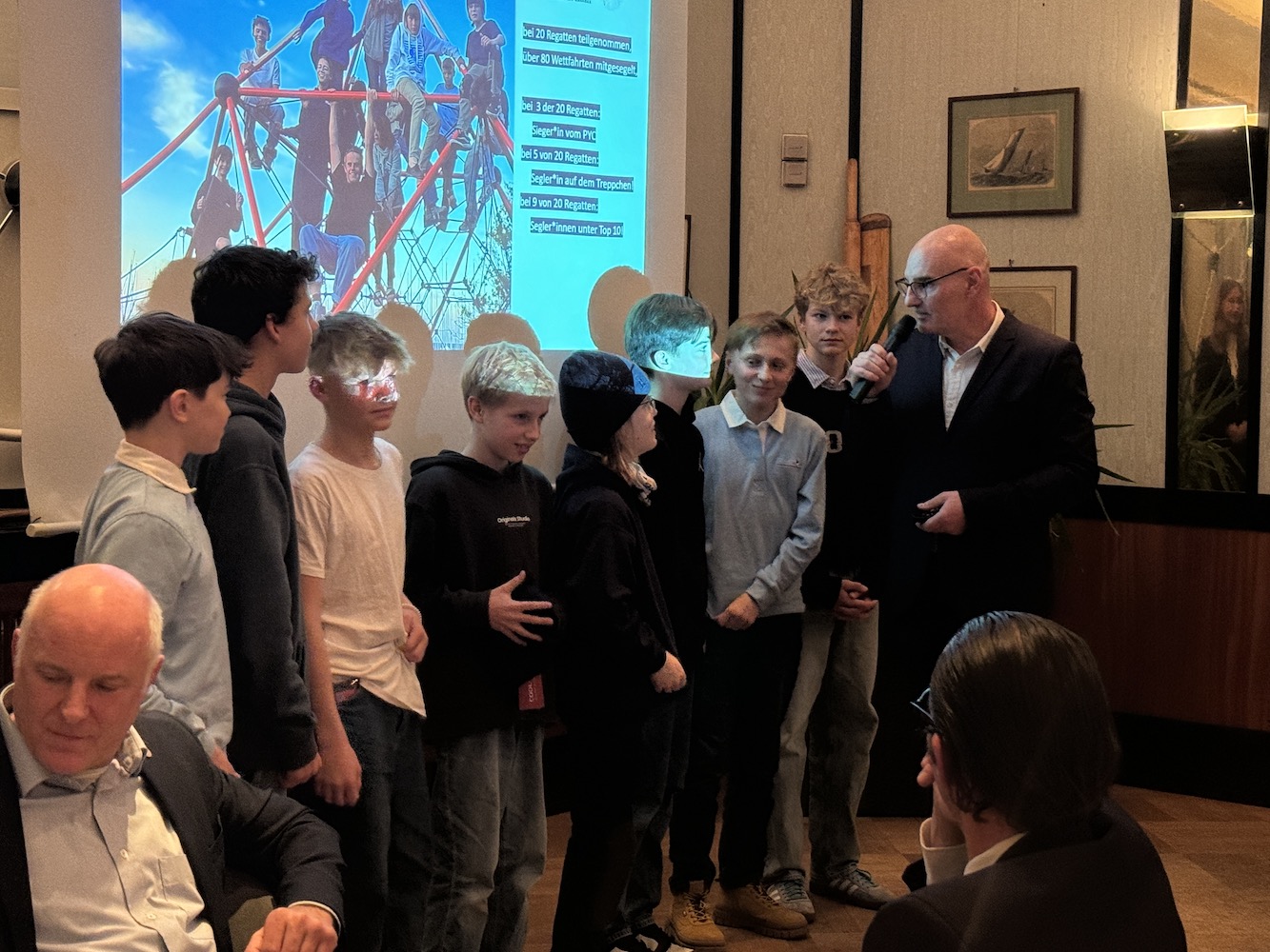 Die Ehrung der Jugendlichen übernahm Sportobmann und ebenfalls kommissarischer Jugendobmann Carsten Hanisch, der als erstes das ILCA-Team des vergangenen Jahres mit ihrem Trainer Bruno Schultze auf die Bühne bat. Theo Romey, Paul Hirschberger, Jakob Fehlberg und Samuel Böttger wurden für ihre enormen Fortschritte im ILCA 4 (z.T. inzwischen ILCA 6) ausgezeichnet.