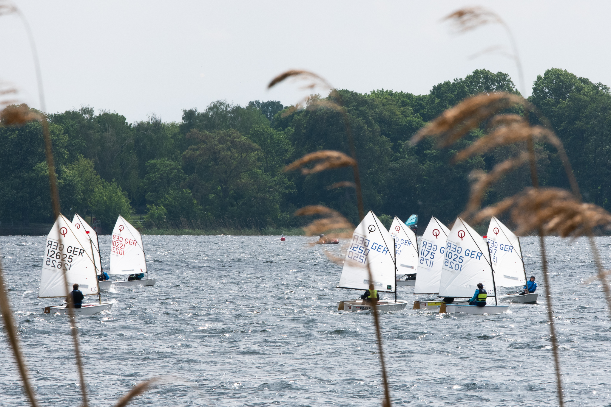 Am Freitag vor der Regatta hieß es deutschlandweit: Unwetterwarnung. Am Samstag waren Sturm- und Regenfronten nicht vorbei. Auch wenn man in Berlin von gemäßigtem Unwetter sprechen konnte, bedeutete das für die jungen Segler trotzdem Windstärken in Böen um 7 Bft und für einen Binnensee ordentliche Wellen. Dazu kam ein Temperatursturz um ca. 10Grad.