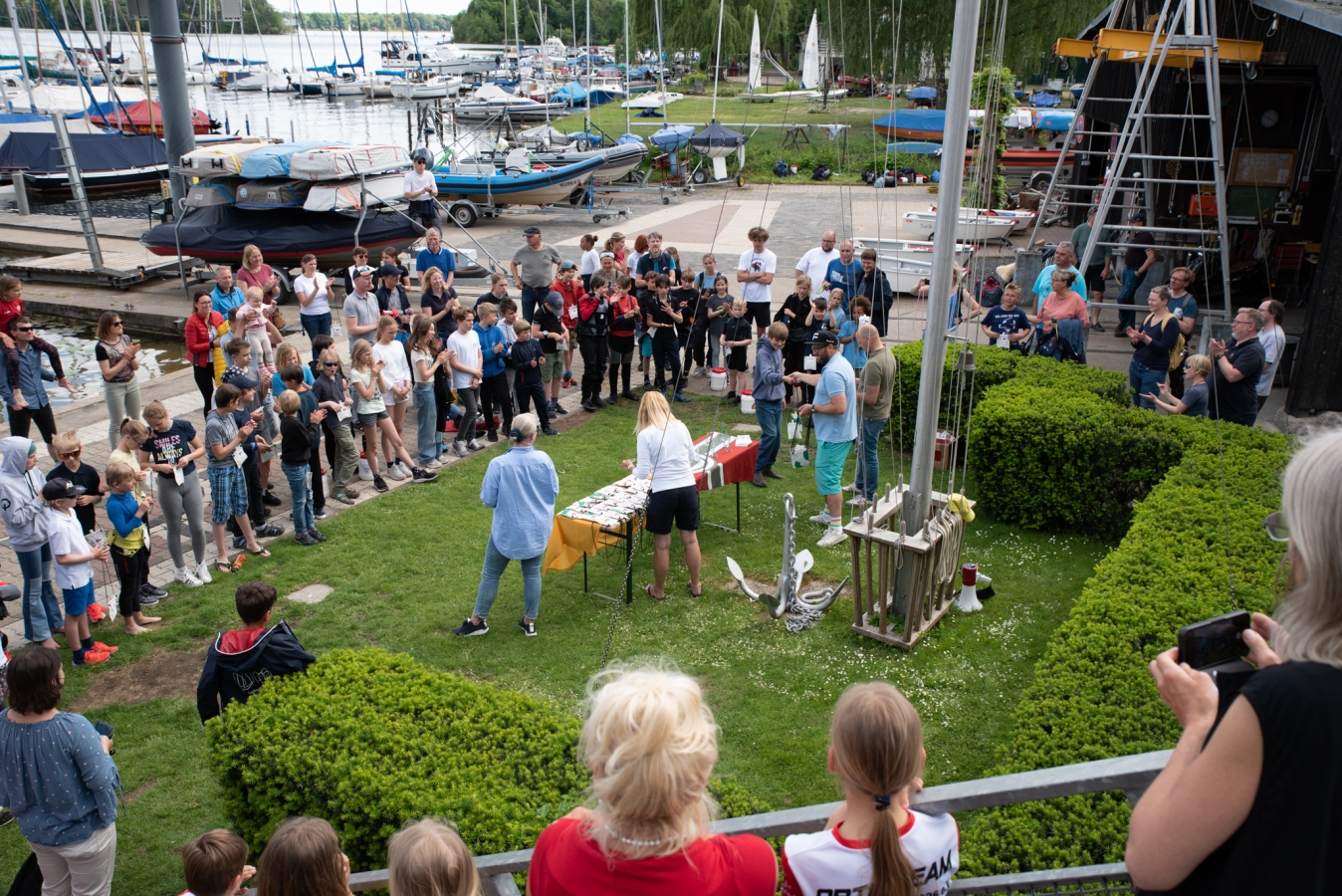 Entschädigung gab’s dafür am nächsten Tag. Alle konnten segeln. Stabiler Wind um 3 Bft, perfekt zum Segeln, ab und an kam Sonne durch. Drei Wettfahrten wurden durchgeführt, eine vierte zum Nachmittag abgebrochen. Zur Siegerehrung bekam dann jeder Teilnehmer einen Preis: liebevoll genähte Umhängebeutel aus alten Segeln – gefüllt mit Süßigkeiten. Die Veranstalter haben verstanden, die Jüngsten zum Regattasegeln zu motivieren. Vielen Dank!