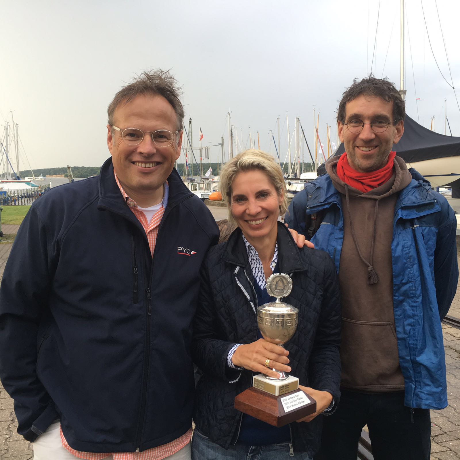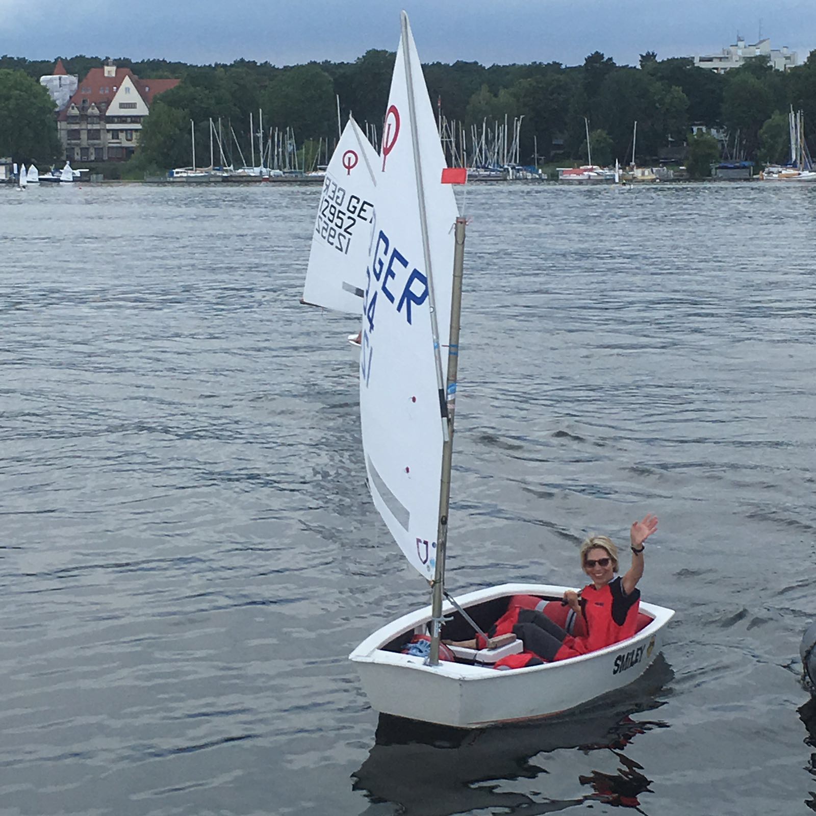 Knieschützer, Freizeitklamotten und hautenge Neos unter zu engen Schwimmwesten? Dazu verlorene Sprit und Stehsegler? Zeit für die Elternoptiregatta im PYC. Schwierige Bedingungen am Wannsee. Yardsticksegler bleiben im Hafen und genießen das kühle blonde auf der Terrasse, da fast kein Lüftchen mehr auf dem See geht. Was machen die Opti Eltern? 17 mutige Eleven und Profis machten sich am Mittwoch, den 13.7.2016 auf, um den Elternpokal auszusegeln. Kein Wind und eine nahende Gewitterfront bestimmten das Geschehen auf der Regattabahn. Nicht nur, dass man den Namen des Bootes kaum noch lesen kann, wenn die Eltern drinsitzen, vielmehr sind es rein praktische Fragen, die es zu beantworten gilt: Kann man im Opti liegen bleiben und den Hintern nach einer Wende dann in Lee sitzen lassen? Kann man auch im Stehen segeln? Muss man die Regeln einhalten? Die zahlreichen PYC Kinder waren Schiedsrichter und haben sogar Kontrollvermesssungen mit Ausnahme des Höchtsgewichtes des Steuermenschen nach dem Zieleinlauf vorgenommen, keine Beanstandungen festgestellt und zudem angefeuert und Tipps gegeben. Ein Heidenspaß, der beim gemeinsam Grillen, selbstgemachten Speisen und Getränken von der PYC Ökonomie ausklang. Ach ja. Es gab noch Preise und Geschenke! Siegerin mit unfassbar großem Vorsprung wurde, wie im Vorjahr, Gesa Hunger vor dem amtierenden Europameister im Piraten, Sascha Schröter vor Hartmut Papenthin. Ein famoser Abend bei Gewitter, Hagel und Regen klang sehr lustig aus. Wir sehen uns im nächsten Jahr wieder und dann mit noch mehr als 17 Booten!