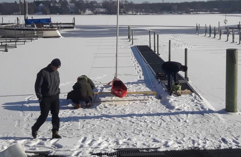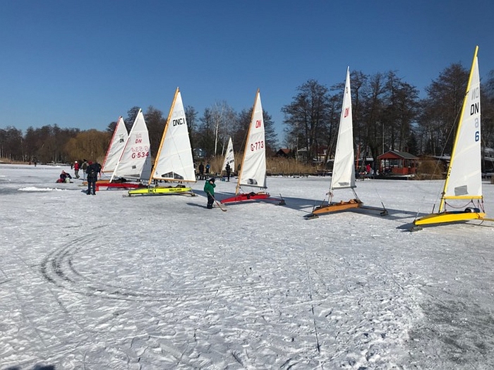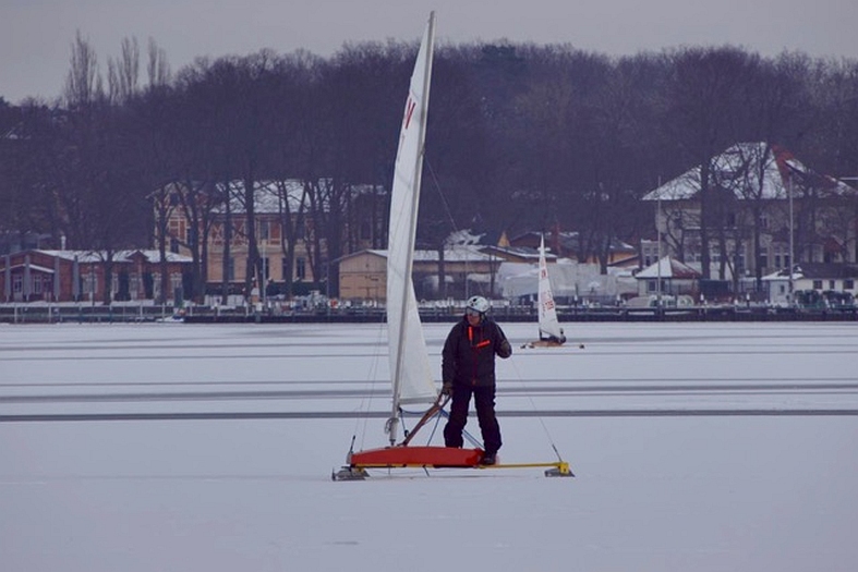 Nach einer Woche Dauerfrost war sogar unser Wannsee zugefroren. Der Rangsdorfer See war schon ein paar Tage früher dicht. Doch der viele Schnee ließ das Eis nicht wachsen, so dass noch am vergangenen Donnerstag ein paar Begehungsversuche mit sehr nassen Beinen endeten. An Segeln war nicht zu denken.