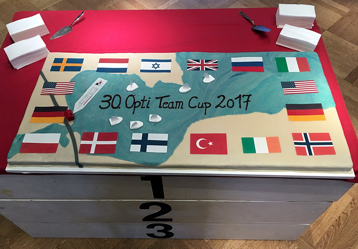 Nach diesen enormen Anstrengungen konnten sich alle Teilnehmer, Teamleader, Schiedsrichter und Helfer am speziellen Jubiläumskuchen zur 30. Auflage des Opti Team Cups stärken. Eingeladen und anwesend waren zu unserer Freude auch die Initiatoren und langjährigen Wegbegleiter des Team Cups, Gabi Grobe und Günther Hofmann vom PYC und Reiner Quandt vom Segler-Club Gothia.