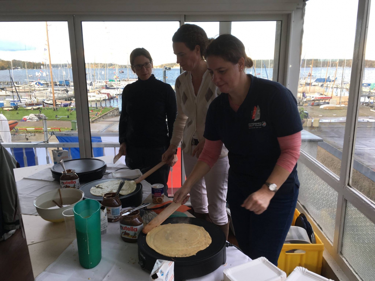 Nachdem alle Teilnehmer ihre Boote und ihr Equipment wieder verpackt hatten und sich bei der leckeren Pizza des Wirtes und den Rekordmengen an Crêpes, zubereitet vom “Schmier-Team“, gestärkt hatten, konnte dann zur Siegerehrung im großen Saal des PYC Clubhauses geschritten werden. Dieses “Schmier-Team“ war übrigens, wie an der Bezeichnung leicht zu erkennen, auch für die Vollversorgung aller Beteiligten auf dem Wasser mit “Lunchies“ und Kakao zuständig.