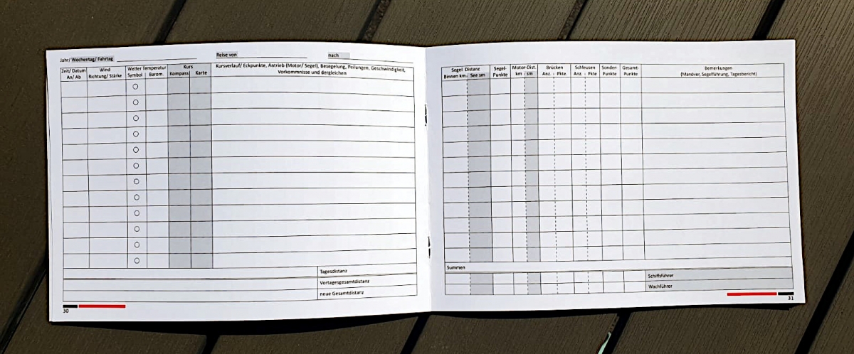 Für die differenzierteren Eintragungen bei Fahrten auf Seerevieren stehen jeweils die Doppelseiten zur Verfügung.