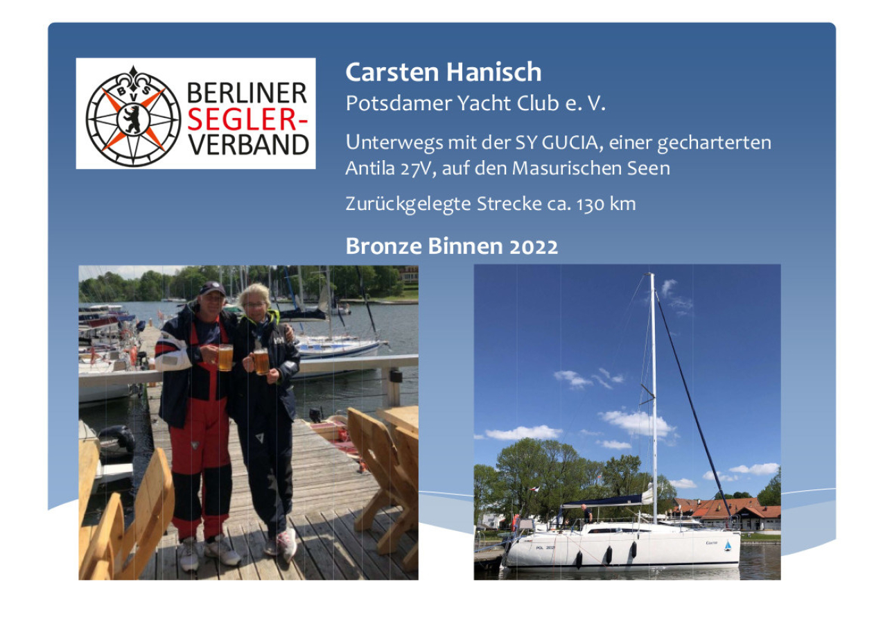 Darüber hinaus segelte Matthias Haller – gerade am Vorabend übrigens frisch zum BSV-Fahrtenobmann des Reviers Wannsee gewählt (!) – in der Sparte Breitensport auf den ersten Tabellenplatz und wurde mit der Goldmedaille belohnt.