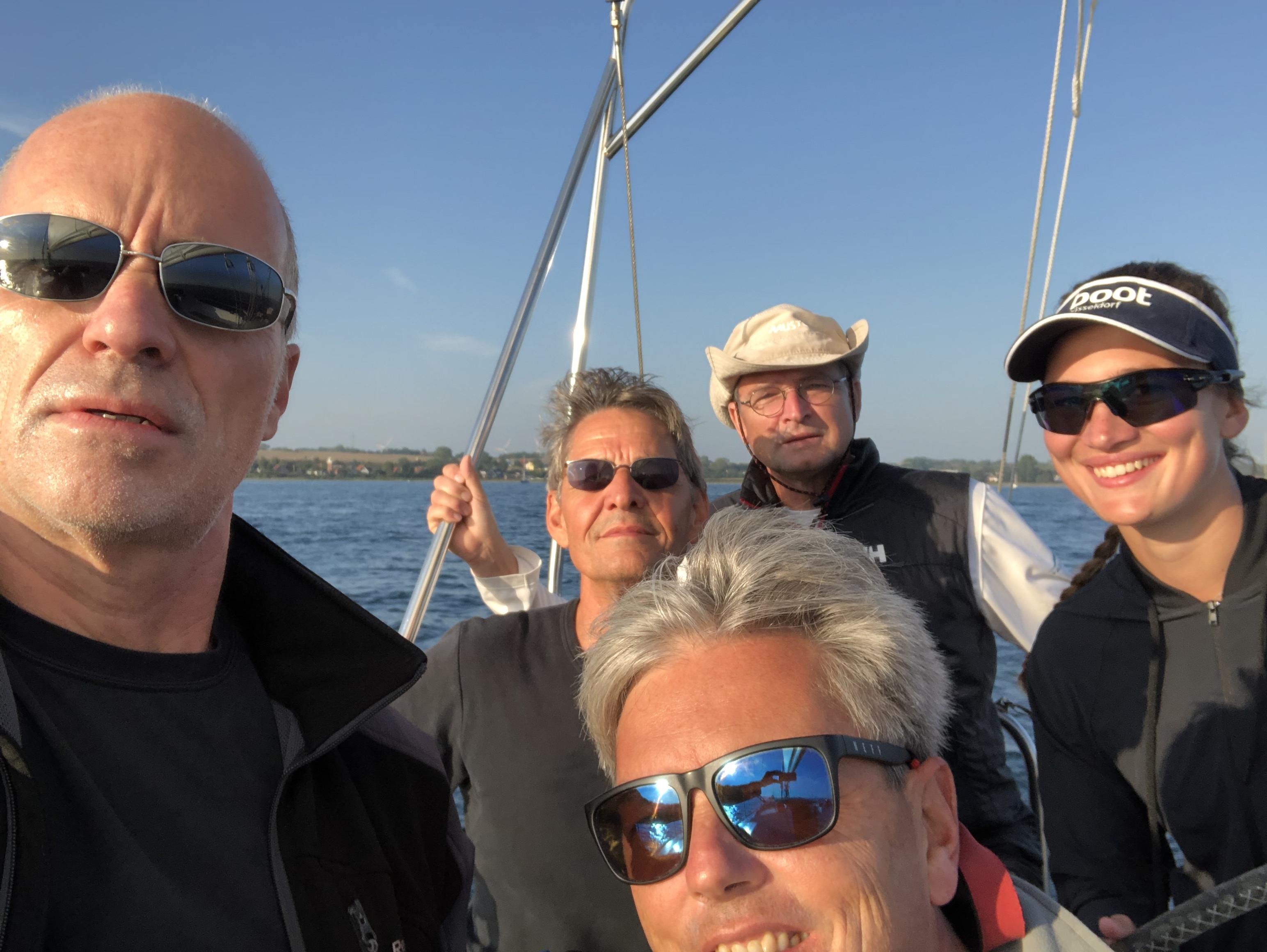Um 9 Uhr starteten wir in Richtung Fehmarnsundbrücke, leider nur bei leichtem Ostwind, der etwas schwach für unser schweres Schiff war. Durch herausragende Kreuzschläge, möglichst nahe der Insel, hat Constanze den Abstand zu den Leichtwindschiffen nicht zu groß werden lassen. Hinter der Brücke nahm der Wind zum Glück zu, wodurch wir locker mit der Konkurrenz mithalten konnten. Durch mutige Schläge im Flachwasser vor der Südostküste Fehmarns, konnten wir uns immer wieder einen Vorteil erarbeiten. Nach dem Staberhuk ging es dann endlich auf Raumkurs und kurz vor Puttgarden kam dann bei halbem Wind auch der Gennaker zum Einsatz. Dadurch erlebten wir unser persönliches Highlight der Regatta, in dem wir eine Luffe 43 überholten, bevor diese ihren Spi setzen konnte. Nach dem Passieren der Fährlinie ging dann auch bei uns der Spi hoch, den wir nach einer rasanten Fahrt mit 8,5 Knoten entlang der Westküste der Insel, erst wieder kurz vor dem Ziel an der Ansteuerung Fehmarnsundwest bergen mussten. Dort überholten wir dann noch die Celestine, die bereits eine halbe Stunde vor uns, in einer anderen Gruppe, gestartet war. Nach 7:47 Stunden und ca. 45 Seemeilen gingen wir vor der Seebrücke Heiligenhafen etwas erschöpft, aber mit unserer Leistung sehr zufrieden, ins Ziel.