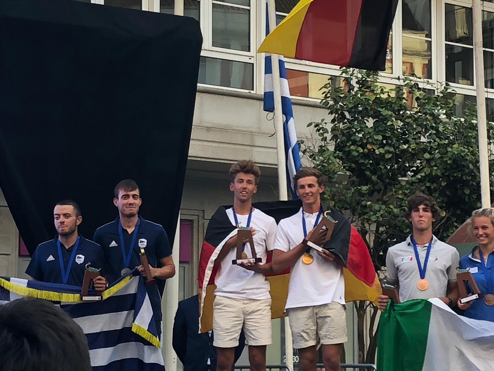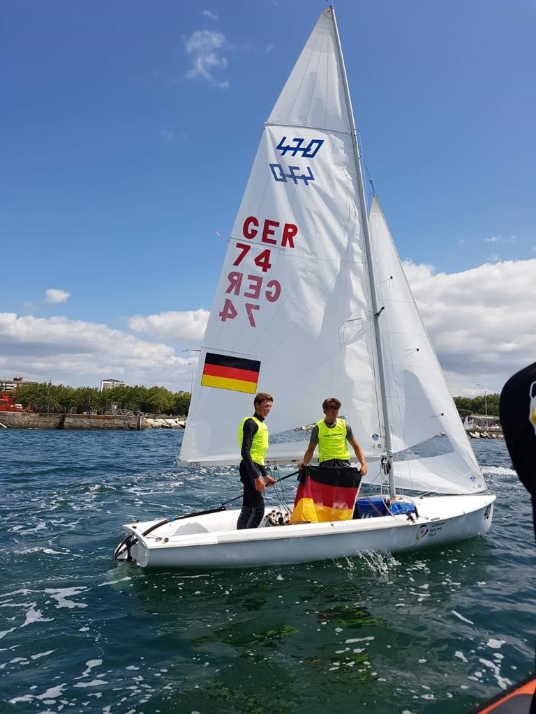 Freddie und Lucas sind seit Juli Junioreneuropameister! In Galicia/ Spanien haben sie dem Erfolg mit der Bronzemedaille bei den Juniorenweltmeisterschaften Anfang Juli in Slowenien noch einen weiteren hinzugefügt. Souverän sind sie nicht nur ins Medalrace eingezogen, sondern haben dort sehr gute Nerven bewiesen und wurden im finalen Medal Race 3. Wir freuen uns mit den beiden und blicken der baldigen Siegerparty schon erwartungsfroh entgegen. Bei den gleichzeitig stattfindenden Junioreneuropameisterschaften der 420er haben Vincent Bahr (YCBG) und Lars Kleinwächter unglücklich das Gold Fleet verpasst und dann im Silber Fleet gezeigt, was sie draufhaben. So standen am Ende versöhnliche 2 Tagessiege und insgesamt der erste Platz im Fleet in den Ergebnislisten. Ergebnisse.