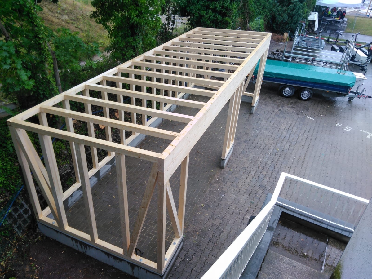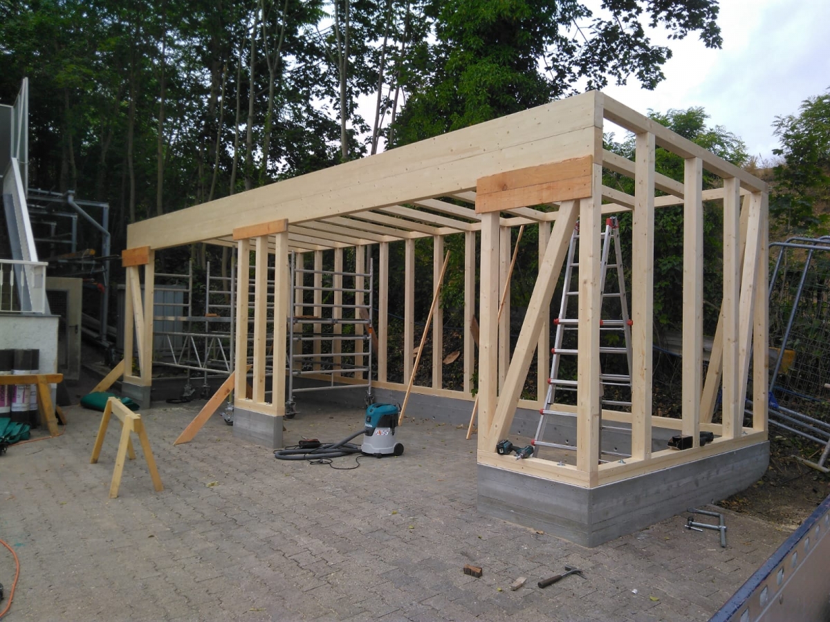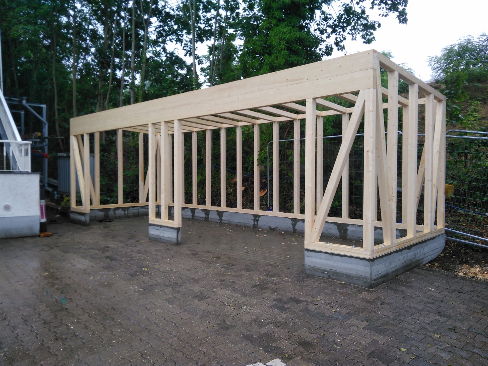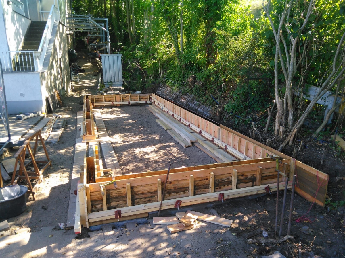 - Guss der Garagenfundamente sowie der etwa kniehohen Sichtbeton-Außenmauern (damit der hölzerne Baukörper spritzwassergeschützt erst oberhalb dieser oftmals nassen Zone beginnt),