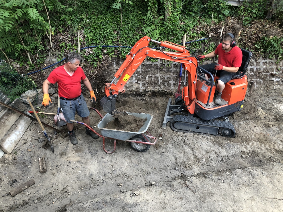 - Erdarbeiten zur Begradigung der zu bebauenden Fläche, in dem Zuge auch gleich die Erneuerung der Frischwasserleitung für den Weststeg,