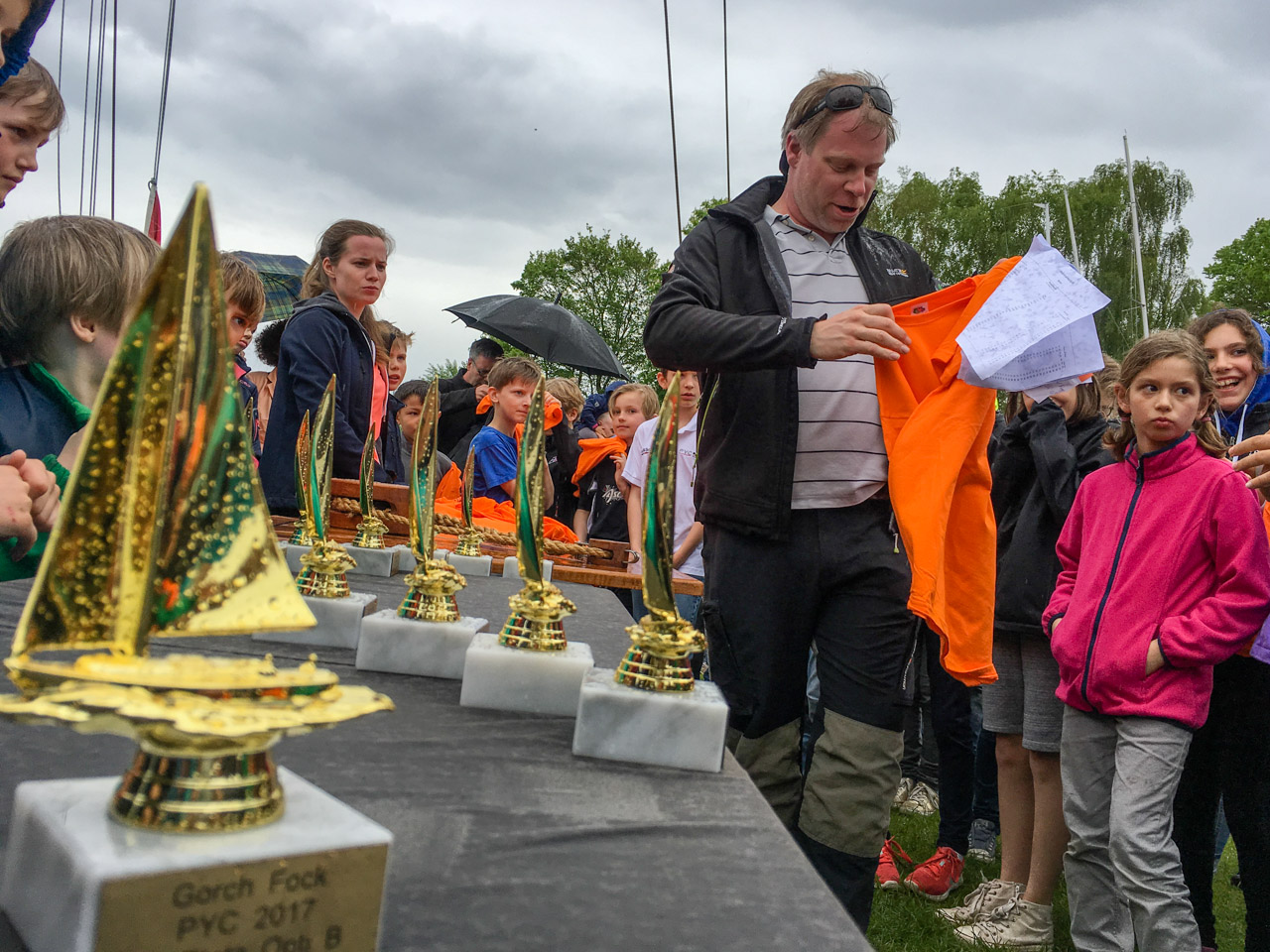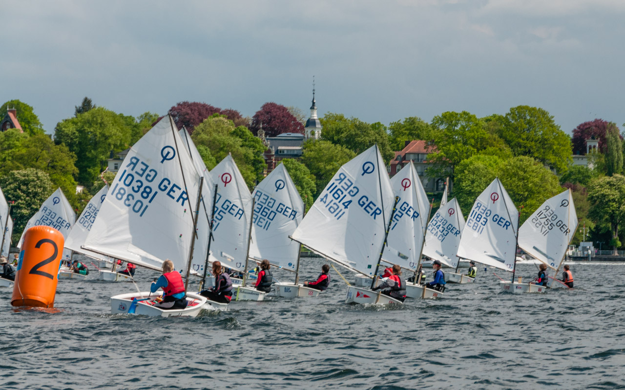 Erster Gorch Fock Preis der Opti B im Potsdamer Yacht Club. Der vom Kommandanten der Gorch Fock, Kpt. z. See Nils Brandt anlässlich des Potsdamer Abends gestiftete imposante Wanderpreis wurde am vergangenen Wochenende direkt vor dem Clubhaus auf dem Wannsee ausgetragen. Der wunderschöne Samstag war zum Baden, Klönen und Warten geeignet, nicht aber zum Segeln. So entschieden sich Wettfahrtleiter Thomas Freundel und Crew zum vorzeitigen Abbruch und Startverschiebung auf den Sonntag. Erneut traten 85 Seglerinnen und Segler an. Alle wollten den Pokal! Nach erneuter Startverschiebung konnte gegen 12 h die erste Wettfahrt angeschossen werden. Der Wind reichte auch noch für eine zweite Wettfahrt, so dass die Pokale nach der leckeren Pizza und den kühlen Getränken für Jung und Alt am späten Nachmittag neue Besitzer fanden. Leider gab es bei der Wertung ein paar Irritationen, die wir zu entschuldigen bitten. Die Übergabe an den verdienten Sieger, Maximilian Melchinger vom Gothia holen wir in großer Runde beim Pfingsfestival nach. Versprochen!! Ergebnisse bei Manage2Sail.