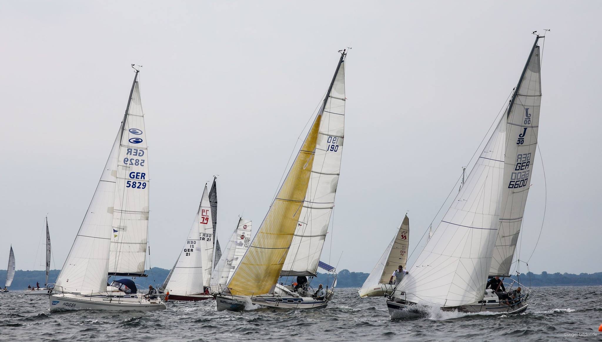 Seesegler auf der Travemünder Woche. Der erste Ausflug der "Greta" von Skipper Thomas Jänicke-Klingenberg mit Crew auf die Ostsee hat bei 12 Startern einen 5. Platz ergeben. Das Bild zeigt Greta (190) zum ersten Start der beiden Mittelstrecken-Regatten. Taktiker Moritz Paschen, Laser Experte und auch Steuermann der Bundesliga, war beeindruckt von Kräften, die auf einem Großboot herrschen, und würde sofort wieder anheuern! Ergebnisse unter Manage2Sail.