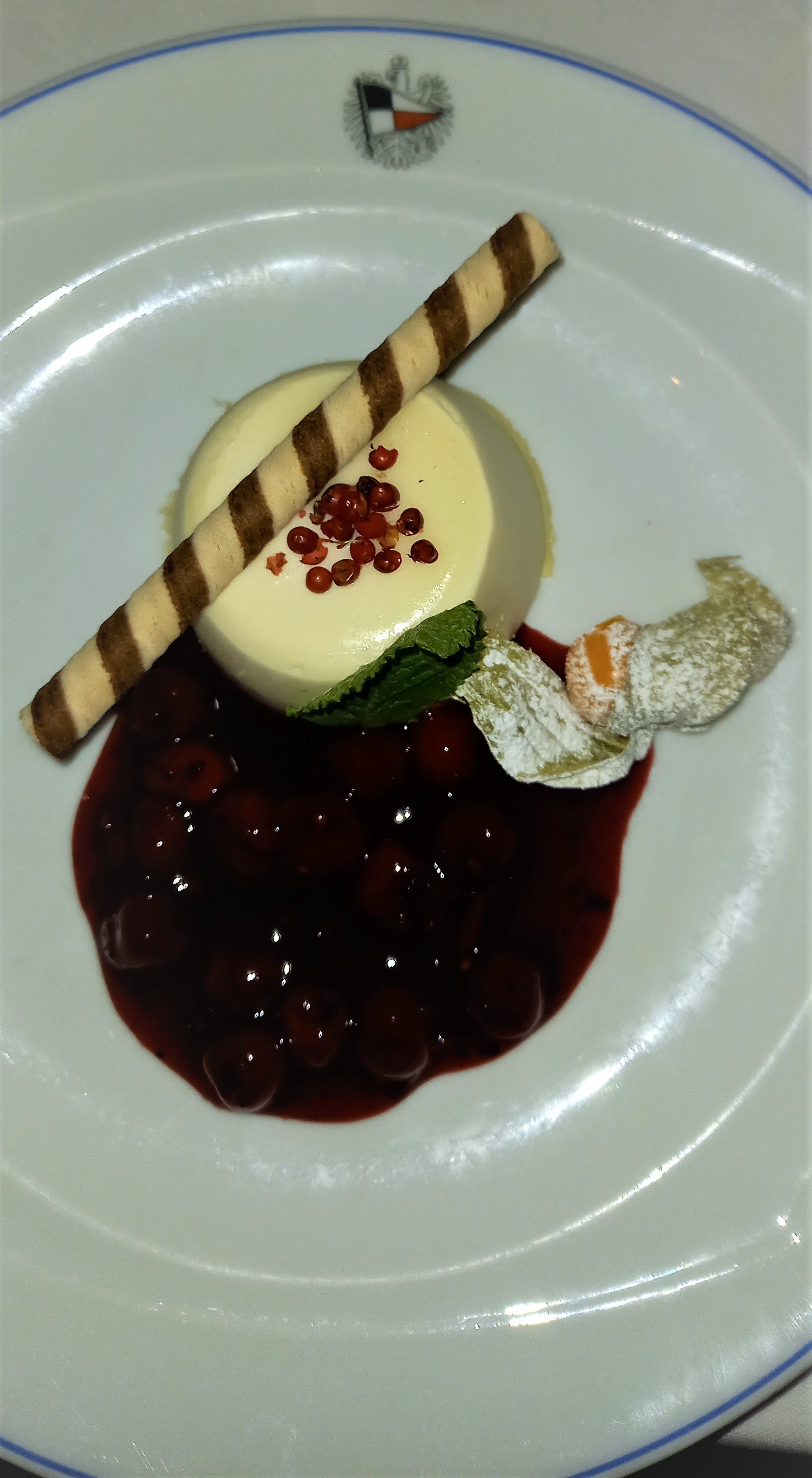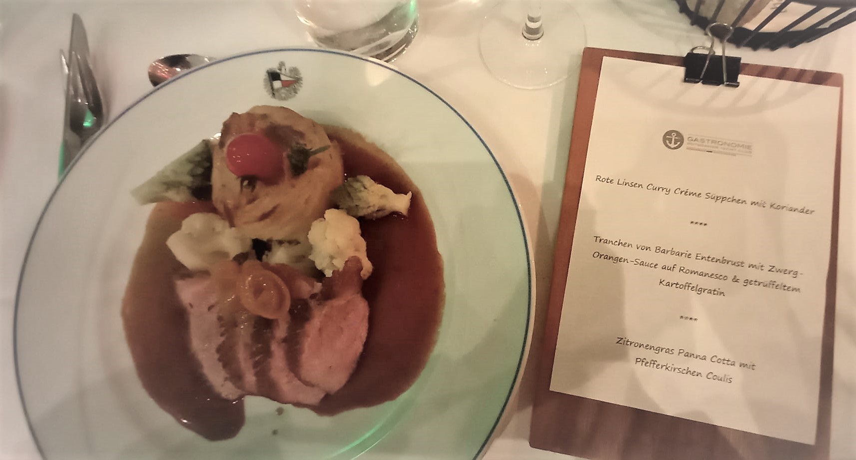 Während des Hauptganges, zartrosa gegartes Roastbeef auf einem Barolo- Rotweinspiegel, Kartoffelgratin und grüne Bohnen im Speckmantel, wurde sich lebhaft über diverse Erlebnisse auf Rahseglern, Kreuzfahrten oder auch Seetörns ausgetauscht. Ein Kaiser-schmarrn mit warmen Zimtpflaumen rundete das köstliche Menue ab, und ein sehr unterhaltsamer wie kurzweiliger Abend fand seinen Ausklang. Dem Referenten und Herrn Thamm mit seinem Team sei hierfür noch einmal herzlich gedankt.