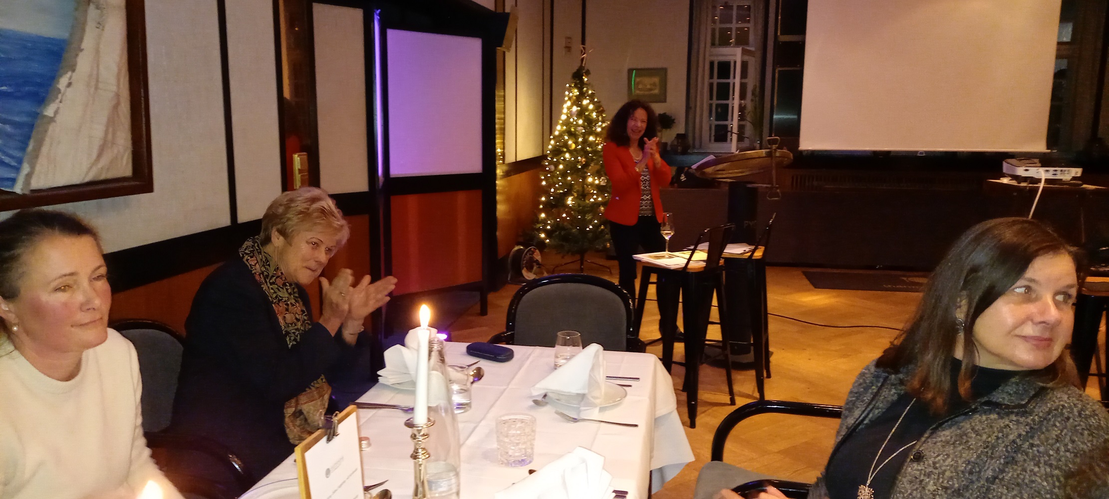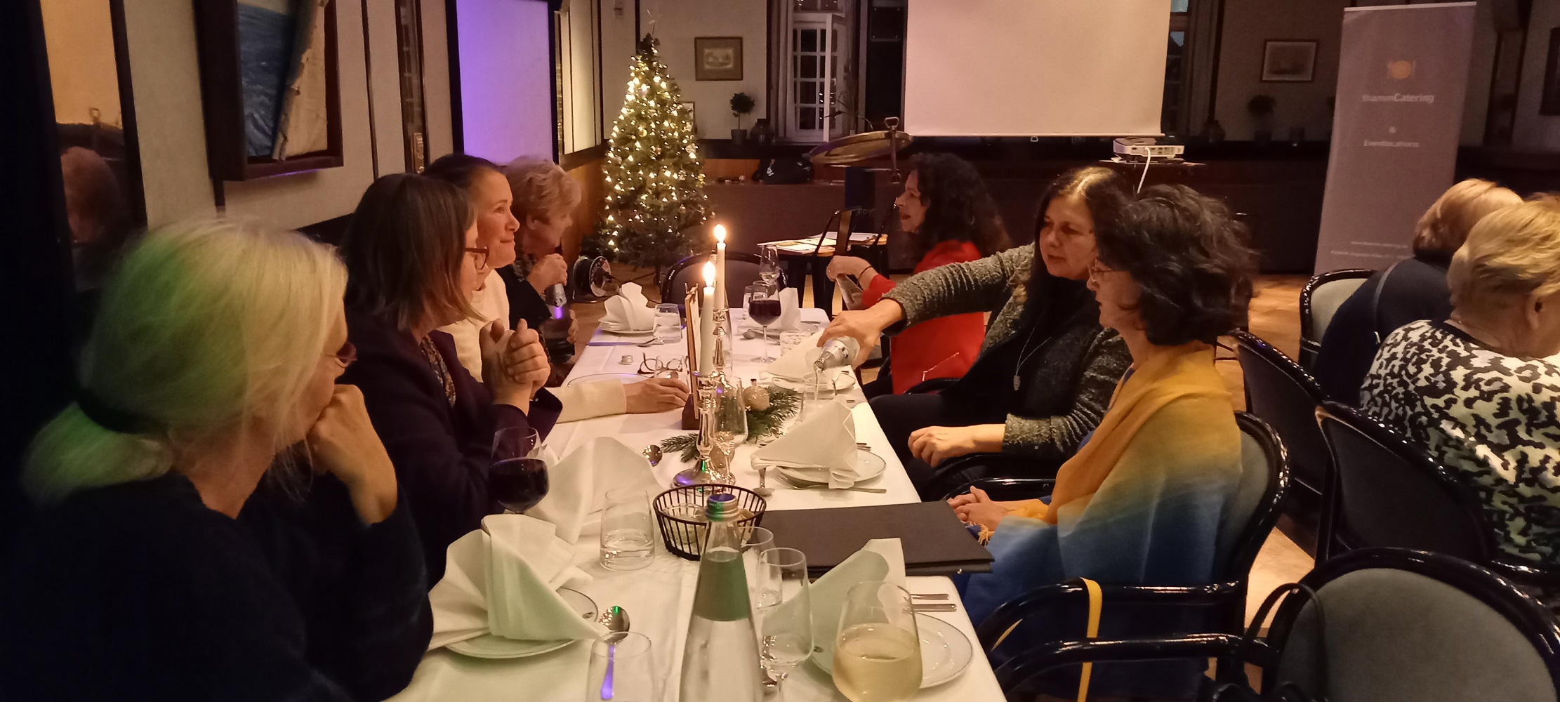 Bei anregenden Getränken gab es so manches freudiges Wiedersehen und viele interessante, neue Begegnungen. Mit Rote-Linsen-Süppchen, Barberie- Entenbrust und Panacotta-Kirschen-Dessert servierte das Team um Herrn Thamm wieder eines seiner köstlichen, vorweihnachtlichen Menüs.