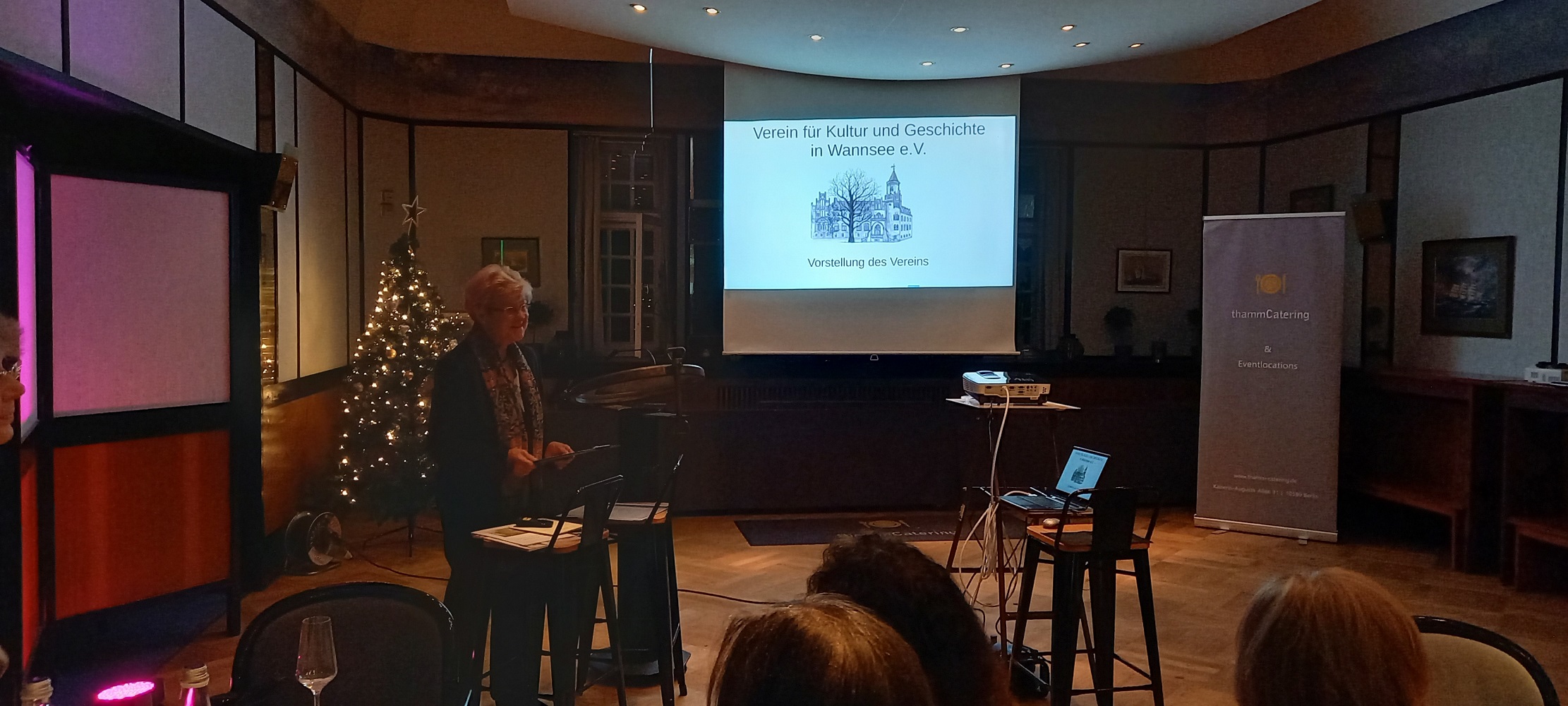 Als Vorsitzende des „Vereins für Kultur und Geschichte in Wannsee“ erzählte sie, illustriert mit Fotos und Grafiken, von der Geschichte dieses Ortsteils im Bezirk Steglitz-Zehlendorf, im äußersten Südwesten der Stadt, von seinen Bewohnern und deren Schicksal und Bedeutung, von den Besonderheiten in Stadtplanung und Architektur. Frau Bolte machte aufmerksam auf die zahlreichen Spuren der bewegten Geschichte Wannsees, auf verschwiegene Parks, versteckte Denkmale, überwucherte Zeugen vergangener Jahre. Das war anregend und machte Lust darauf, mal auf eigene Faust zu Fuß oder mit dem Fahrrad auf Entdeckungstour zu gehen.