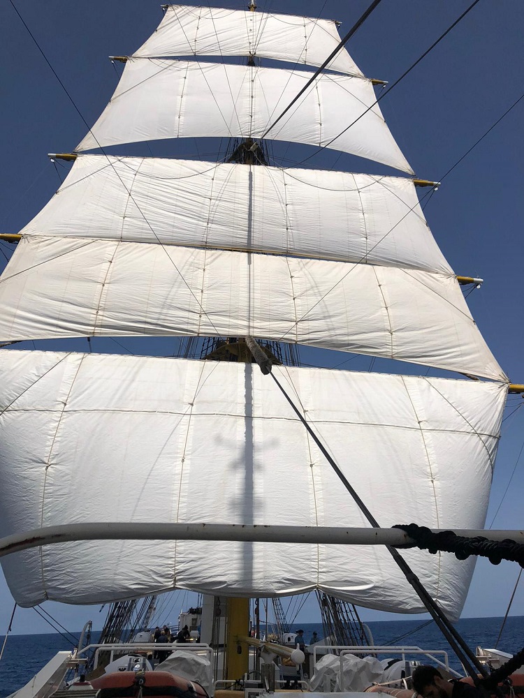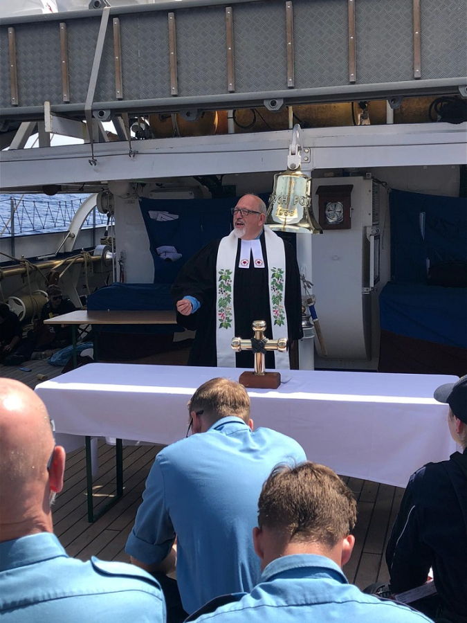Das Segelschulschiff ist am 20. März zu seinem 175. Ausbildungstörn gestartet und unter Motor durch den Ärmelkanal, entlang der Atlantikküste über Brest nach La Coruña gefahren. Nächstes Ziel ist Cádiz, und zum Glück steht der Wind nun so günstig, dass seit dem Verlassen des ersten spanischen Hafens unter Segeln gereist werden kann. Auf der Höhe von Lissabon wurde heute an Bord ein Ostergottesdienst unter strahlend blauem Himmel abgehalten. Außerdem gab es feiertägliches Gebäck vom Bordbäcker!
