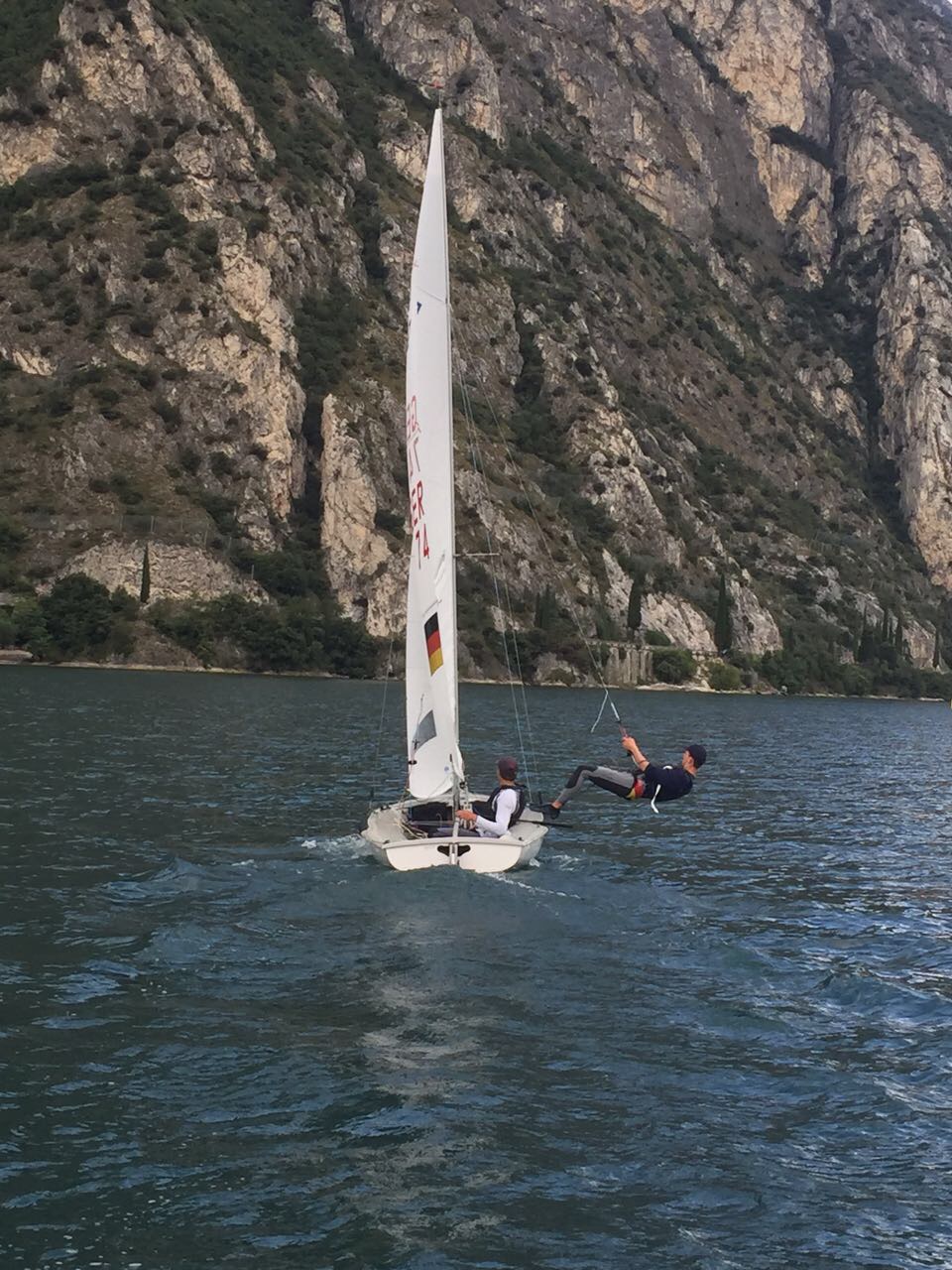 Vom 8. bis zum 13. August 2017 fanden in Riva/ Gardasee die Junioren Europameisterschaften der 420er und der olympischen 470er statt. Im 420 waren Linus Klasen mit Steuermann Daniel Göttlich (VSaW) am Start. Angereist als deutscher Meister und als Vizeeuropameister des letzten Jahres machten sie sich Hoffnungen auf einen Platz auf dem Treppchen. Am Ende wurden sie als bestes deutsches Team 6. von über 100 Booten. Ein toller Erfolg, auch wenn die Enttäuschung in Linus Bericht herauszuhören ist. Wer weiß, was drin gewesen wäre, wenn die Unterkunft bei nächtlichen mehr als 30°C über eine Klimaanlage verfügt hätte...: „Daniel und ich reisten nach nur einem Tag Pause nach der Deutschen Meisterschaft in Travemünde bereits am Dienstag den 1. August zur JEM am Gardasee an. Die Vorbereitungswoche diente dazu, das Revier kennen zu lernen und die Trimms auf die Bedingungen anzupassen. Geprägt war die erste Woche von viel Wind (Ora) und sehr heißen Temperaturen. Für uns waren das Traumbedingungen, sind wir doch bei viel Wind regelmäßig sehr schnell. Es lief alles reibungslos. Am Tag der Vermessung, also direkt vor dem Beginn der Wettfahrten, kam ein ziemlich großes Unwetter auf. Dadurch kühlten sowohl das Wasser als auch die Außentemperaturen erheblich ab. Pünktlich zum Start der ersten Wettfahrt blieb leider der sonst so verlässliche thermische Wind (Ora) aus. Das bedeutete für uns komplett neue Bedingungen auf die wir nicht eingestellt waren. Der erste Tag ging daher für uns nicht sehr gut los mit einem Wettfahrtabbruch, bei dem wir in Führung lagen. Am Ende standen am ersten Tag ein zweiter und ein 48. Platz in der Ergebnisliste. Somit hatten wir unseren Streicher schon am ersten Tag eingefahren, was die kommenden Tage nicht einfacher machte. Es waren nicht unsere Lieblingsbedingungen!! Wir hatten zwar manchmal gute Einzelplatzierungen aber es war sehr schwer, konstant zu fahren, auch wenn wir natürlich wissen, dass es für alle dieselben Bedingungen waren. Am letzten Tag konnten wir uns im Goldfleet noch mal beweisen und uns auf Rang sechs insgesamt vorarbeiten. Ein gutes Ergebnis ist es auf jeden Fall, doch wir haben gemerkt, dass mehr drin war. Vielen Dank an die Mitglieder des Potsdamer Yacht Club für die Unterstützung, ohne die eine Teilnahme an der Regatta nicht möglich gewesen wäre.“