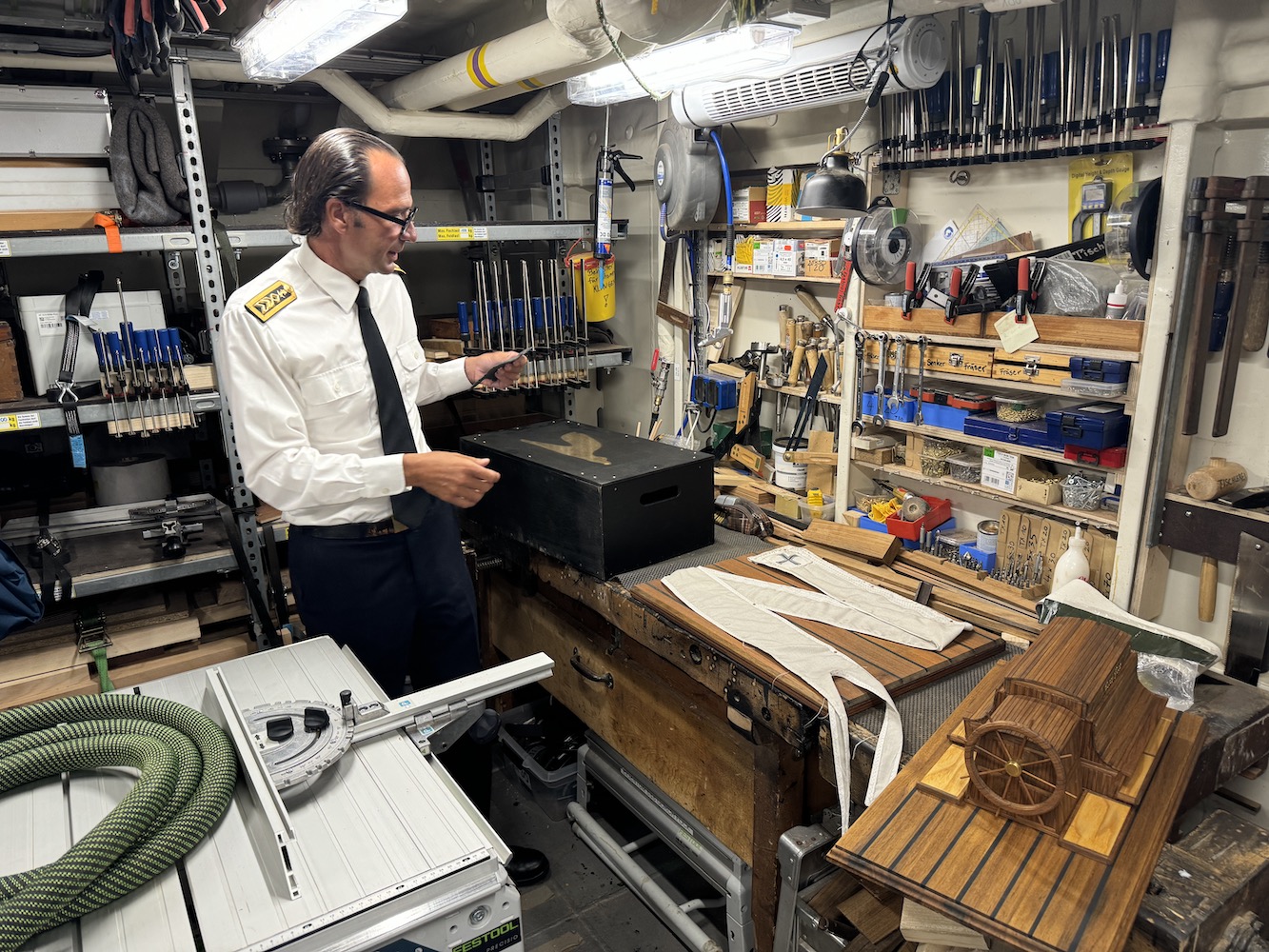 OStBtsm Steffen Kreidl führte uns anschließend in die Werkstatt, um uns das selbstgebaute Abschiedsgeschenk der Besatzung für ihren Kommandanten zu zeigen: ein detailgetreues kleines Modell des „Klaviers“ der Gorch Fock – mit einer geschickt verborgenen Schublade für einen kostbaren Tintenfüller sowie den Abstellplatz für ein kleines Tintenfässchen, und das alles in einer passenden, schützenden Kiste. Auch der Kommandantenstander, der stets vom Großmast weht, sollte – auf einer hölzernen Tafel aus Decksplanken fixiert – als Wandschmuck überreicht werden.