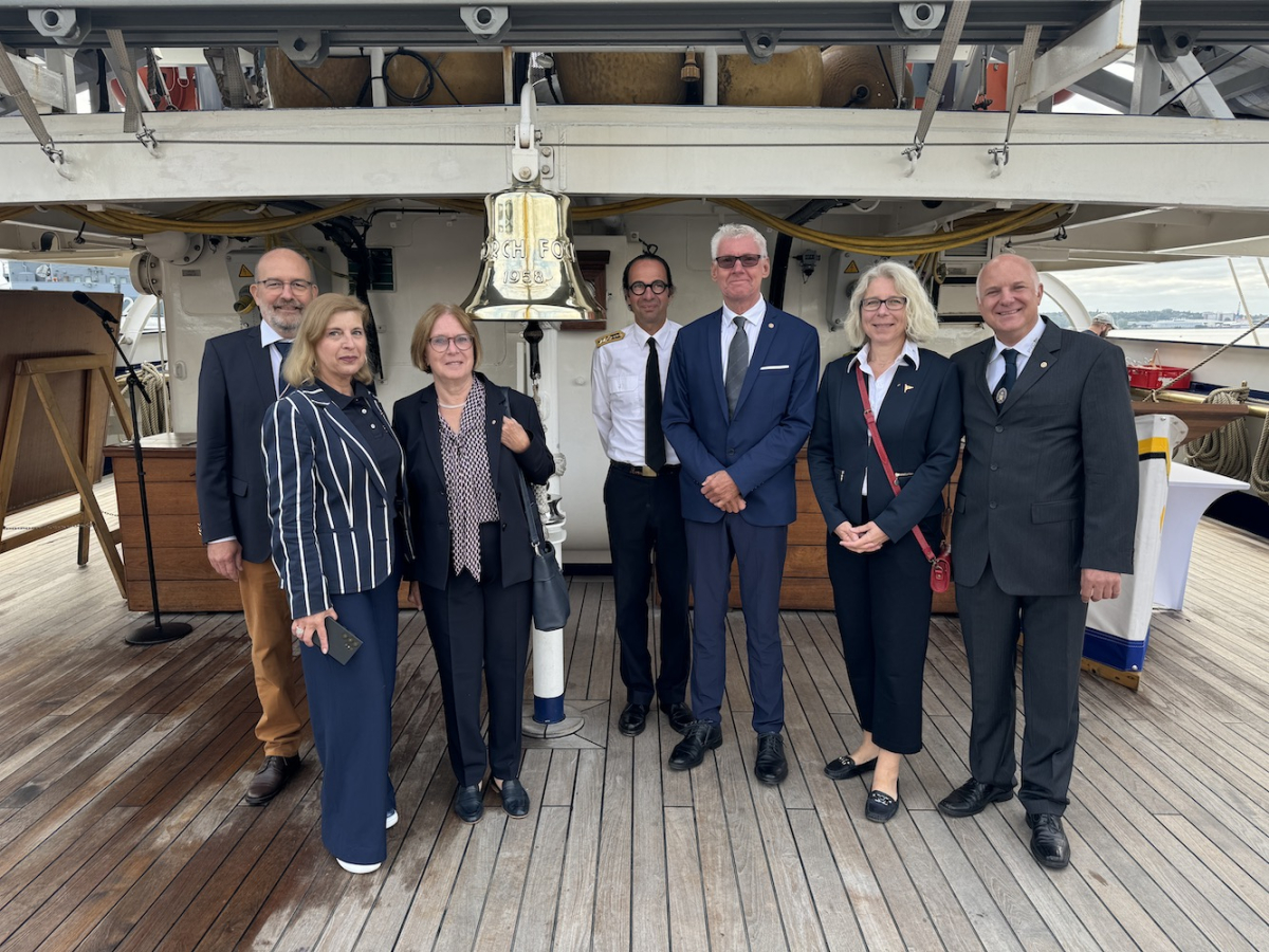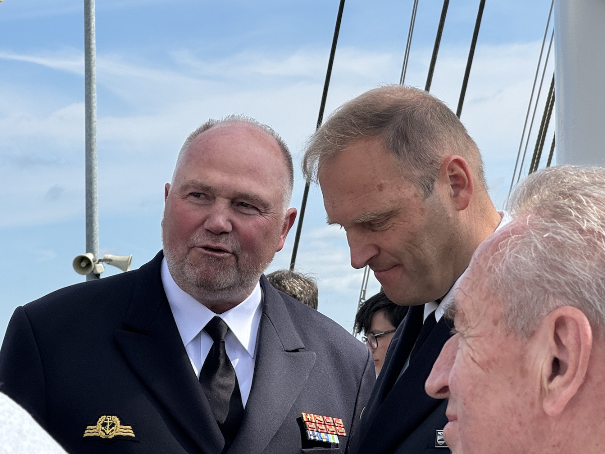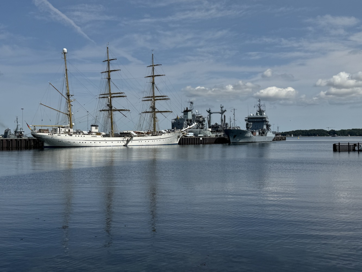 Von 6:10 Uhr bis 16:00 Uhr – der 25. Juli 2024, Tag der Kommandoübergabe von Kpt zS Andreas-Peter Graf von Kielmansegg an FKpt Elmar Bornkessel war minutiös durchgetaktet. Einen wirklich exklusiven Slot von 8:15 Uhr bis 9:00 erhielt die kleine Delegation des Potsdamer Yacht Club, die auf Einladung des scheidenden Kommandanten nach Kiel gereist war: der Erste Vorsitzende, Benedikt Heüveldop, mit Gattin, Irene Schifferer, Gorch-Fock-Connaisseur Dr. Constantin Elfe, unsere Kontaktfrau in der Geschäftsstelle Claudia Adrian, Sportobmann Carsten Hanisch und die hier tippende ehemalige Schriftführerin, Sigrun Putjenter. Es war eine große Freude und eine große Ehre, dabei zu sein und zudem die an diesem Tag wohl einzige Gelegenheit zu erhalten, noch einmal in Ruhe ein Gespräch mit dem Kap’tän führen zu dürfen. In diesem Rahmen konnte der Erste Vorsitzende dem Kommandanten die außerordentliche Mitgliedschaft ehrenhalber (mit Nadel und Urkunde) im Potsdamer Yacht Club verleihen; die ehemalige „Chronistin“ des Clubs überreichte als kleinen Ausschnitt dieser Chronik ein kleines Fotobuch mit Bildern von den wechselseitigen Besuchen zwischen der Besatzung des Segelschulschiffs und dem PYC in den Jahren 2022 bis 2024. Danach musste Graf von Kielmansegg zu den Pressevertretern eilen, die bereits auf der Gorch-Fock-Mole warteten.