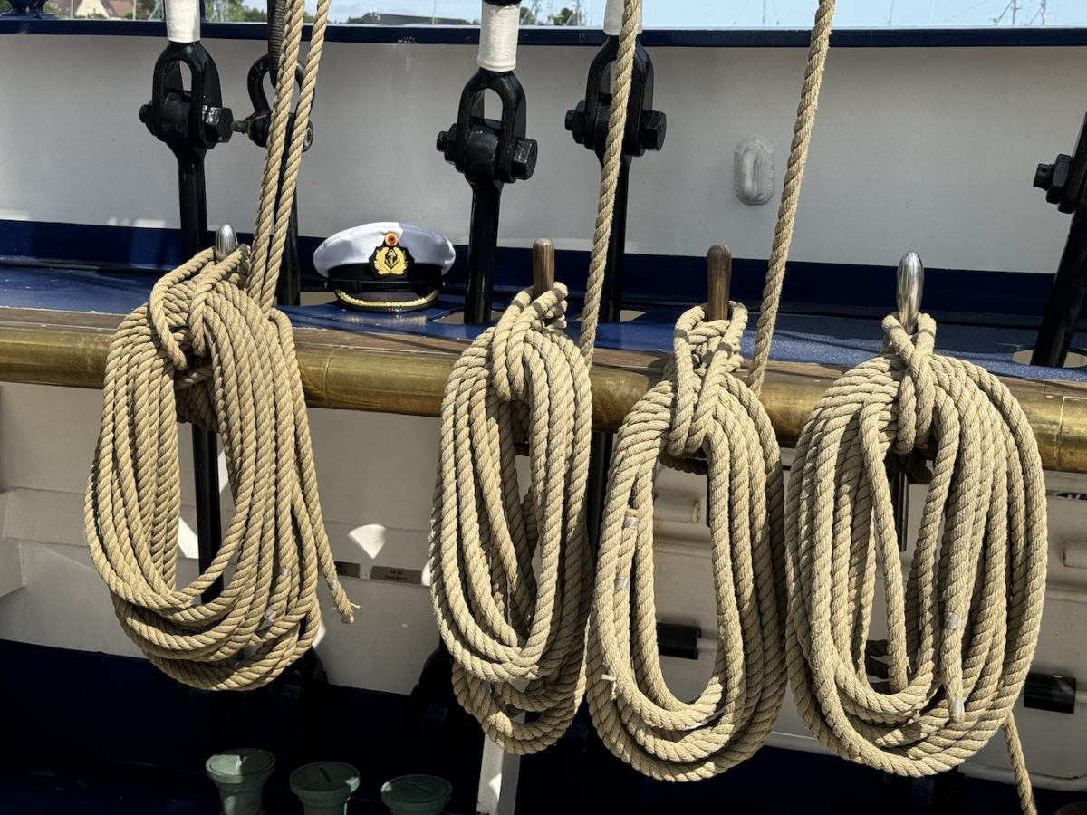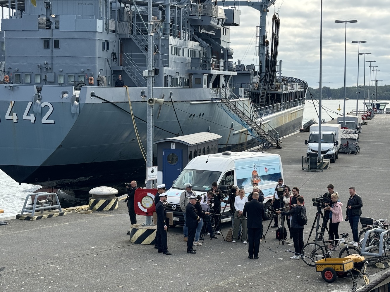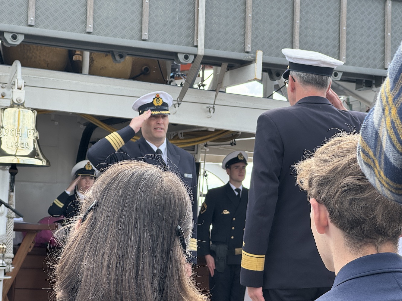 Von 6:10 Uhr bis 16:00 Uhr – der 25. Juli 2024, Tag der Kommandoübergabe von Kpt zS Andreas-Peter Graf von Kielmansegg an FKpt Elmar Bornkessel war minutiös durchgetaktet. Einen wirklich exklusiven Slot von 8:15 Uhr bis 9:00 erhielt die kleine Delegation des Potsdamer Yacht Club, die auf Einladung des scheidenden Kommandanten nach Kiel gereist war: der Erste Vorsitzende, Benedikt Heüveldop, mit Gattin, Irene Schifferer, Gorch-Fock-Connaisseur Dr. Constantin Elfe, unsere Kontaktfrau in der Geschäftsstelle Claudia Adrian, Sportobmann Carsten Hanisch und die hier tippende ehemalige Schriftführerin, Sigrun Putjenter. Es war eine große Freude und eine große Ehre, dabei zu sein und zudem die an diesem Tag wohl einzige Gelegenheit zu erhalten, noch einmal in Ruhe ein Gespräch mit dem Kap’tän führen zu dürfen. In diesem Rahmen konnte der Erste Vorsitzende dem Kommandanten die außerordentliche Mitgliedschaft ehrenhalber (mit Nadel und Urkunde) im Potsdamer Yacht Club verleihen; die ehemalige „Chronistin“ des Clubs überreichte als kleinen Ausschnitt dieser Chronik ein kleines Fotobuch mit Bildern von den wechselseitigen Besuchen zwischen der Besatzung des Segelschulschiffs und dem PYC in den Jahren 2022 bis 2024. Danach musste Graf von Kielmansegg zu den Pressevertretern eilen, die bereits auf der Gorch-Fock-Mole warteten.