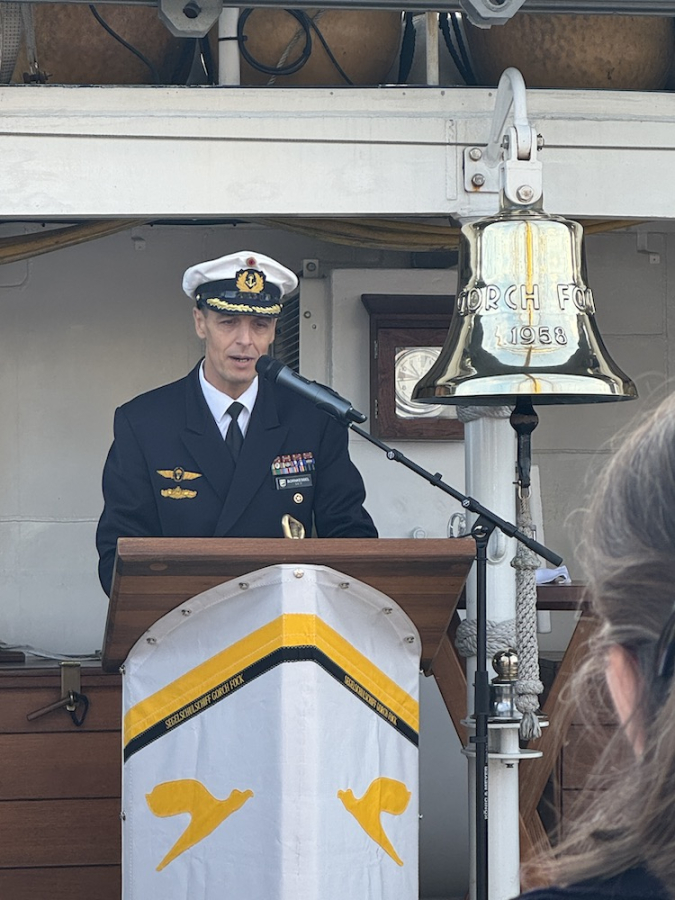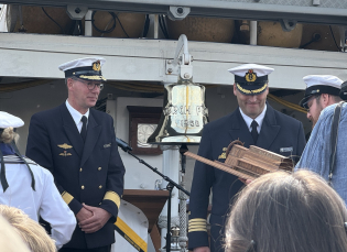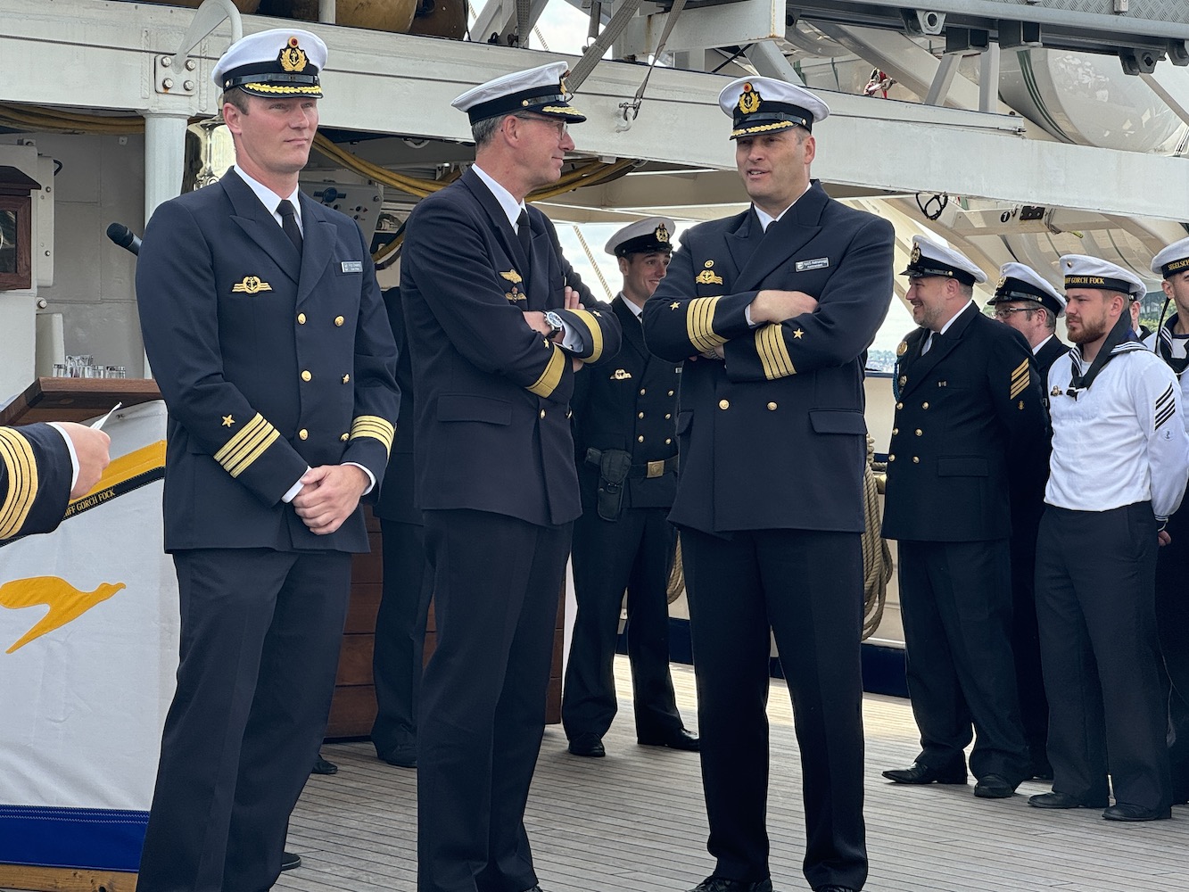 Während der bisherige Kommandant, Kpt zS Graf von Kielmansegg, dem der Abschied sichtlich schwerfiel, sich vor allem bei seiner Mannschaft bedankte, die ihn u.a. „noch einmal die unverbrüchliche Kameradschaft an Bord“ hätten spüren lassen, sich aber ansonsten kurzfasste („Als scheidender Kommandant soll man eigentlich nicht lange reden, da soll man vor allem gehen!“), holte der Kommandeur der Marineschule Mürwik, FltlAdm Jens Nemeyer, etwas weiter aus und führte allen Anwesenden die Leistungen, die Graf von Kielmansegg, innerhalb von nicht einmal zweieinhalb Jahren vollbrachte, vor Augen. Dazu zählten neben zahlreichen schwierigen Manövern mit dem Segelschulschiff (nicht nur in bestimmten Häfen wie St. Malo, sondern vor allem auch bei Events wie der Windjammerparade mit unzähligen kleinen Schiffen, die sich der Gorch Fock immer wieder „auf Armeslänge näherten“) vor allem die Ausbildung sowohl der Kadetten als auch der Stammbesatzung. Schließlich, erinnerte FltlAdm Nemeyer die Anwesenden, sei nach der langen Werftzeit keine vollständige, fertig ausgebildete, eingespielte Stammbesatzung mehr auf dem Schiff gewesen. Innerhalb seiner kurzen Amtszeit habe der Kommandant es aber geschafft, eine solche heranzuziehen und so auszubilden, dass das Schiff nun wieder uneingeschränkt für die Ausbildung der jungen Offiziersanwärterinnen und -anwärter zur Verfügung stehe.