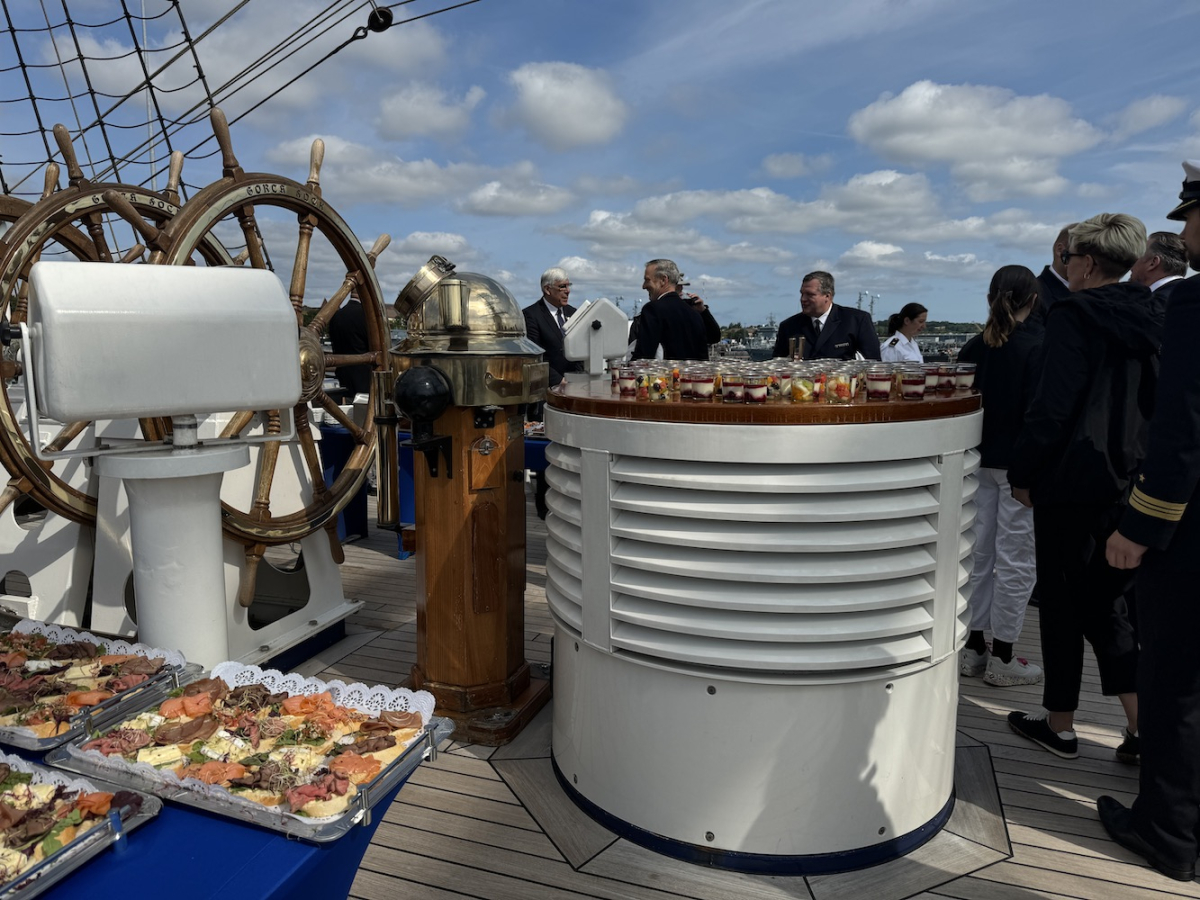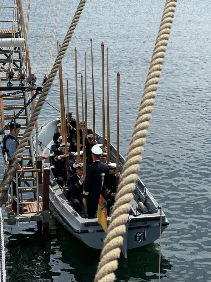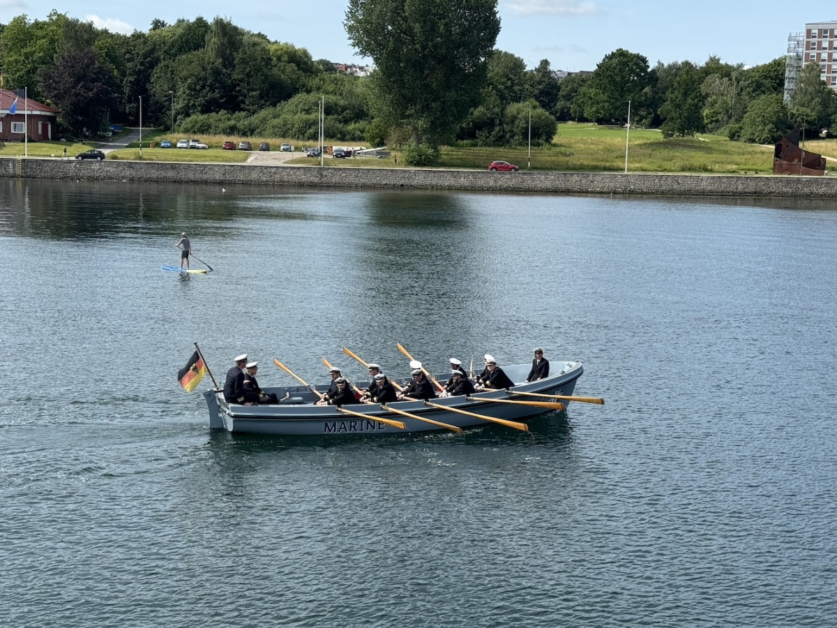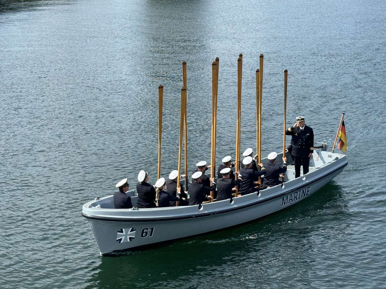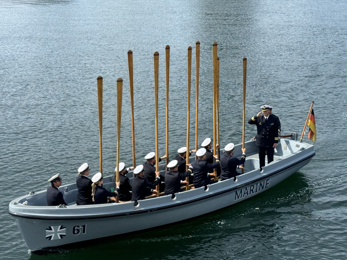 Nach den teils launigen, durchweg warmherzigen Reden wurde zum Empfang aufs Achterdeck geladen. Ein letztes Highlight ließ sich von dort beobachten: „11:45 Uhr: Abpullen Kdt alt“ hieß der Tagesordnungspunkt in der internen Tagesplanung. Die Mannschaft ließ es sich nicht nehmen, ihren soeben verabschiedeten Kommandanten mit dem Kutter von Bord und an Land zu bringen. Auch wenn es dem bescheidenen Grafen von Kielmansegg widerstrebte, dass seine Leute sich für ihn buchstäblich noch einmal in die Riemen legen wollten – ein Abschied über die Stelling wäre undenkbar gewesen. Und so ging, terminlich ganz gemäß Protokoll, ein wunderbarer Vormittag – bei strahlendem Ostsee-Sommerwetter, wofür der schleswig-holsteinische Landtagsvizepräsident Peter Lehnert ein gebührendes Lob von der Marine erhalten hatte – zu Ende.