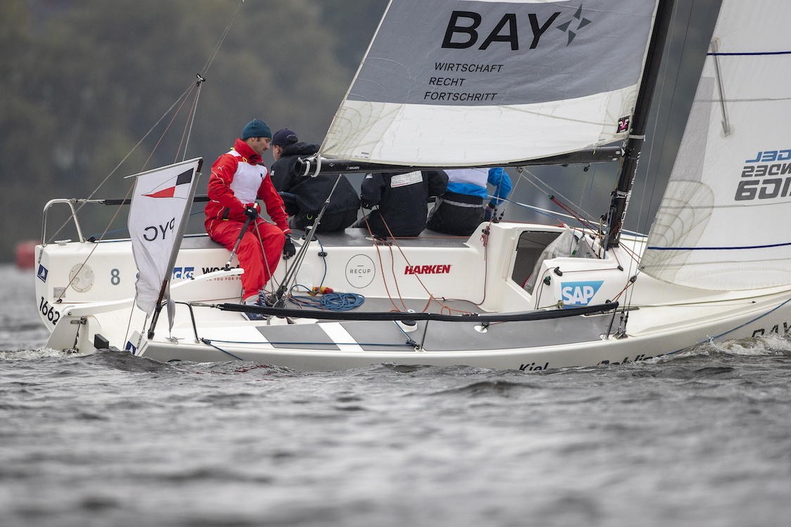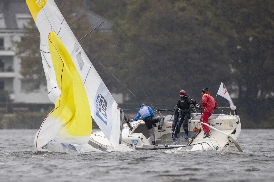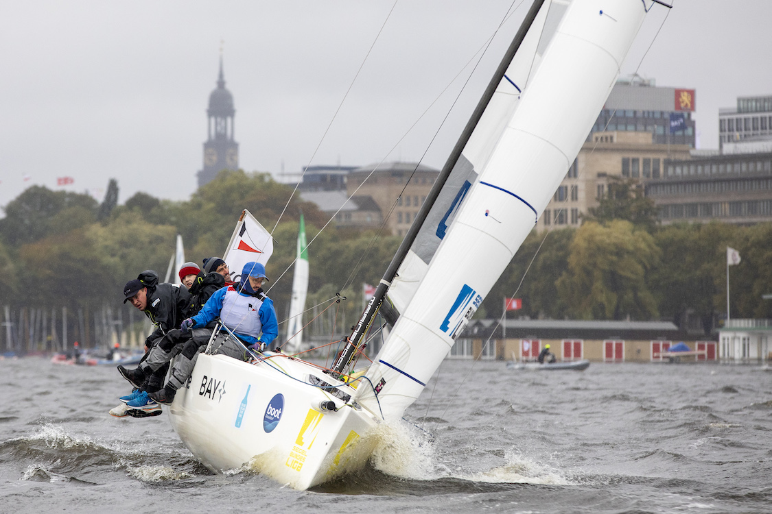 Neben dem Opti Team Cup im eigenen Club und der Berliner Meisterschaft der Internationalen Folkeboote „nebenan" im VSaW, fand die dritte für den Potsdamer Yacht Club unmittelbar interessante Veranstaltung teilweise gleichzeitig, nämlich von Donnerstag, 19. Oktober, bis Samstag, 21. Oktober, in Hamburg statt. Relativ unweit der Ostseeküste gelegen, bekamen die Seglerinnen und Segler auf der Außenalster noch etliches von dem Oststurm mit, der vor allem am Freitag über das Land hinwegfegte. So viele Sonnenschüsse habe sie in der Bundesliga noch nie gesehen, bekannte Anke Nowak, die Geschäftsführerin der Segel-Bundesliga. Selbst routinierte Teams der 1. Liga hätten davon gesprochen, „dass sie ‚eher mit sich selbst beschäftigt waren‘, als sich auf des Rennen konzentrieren zu können.“ (Quelle: DSBL)
