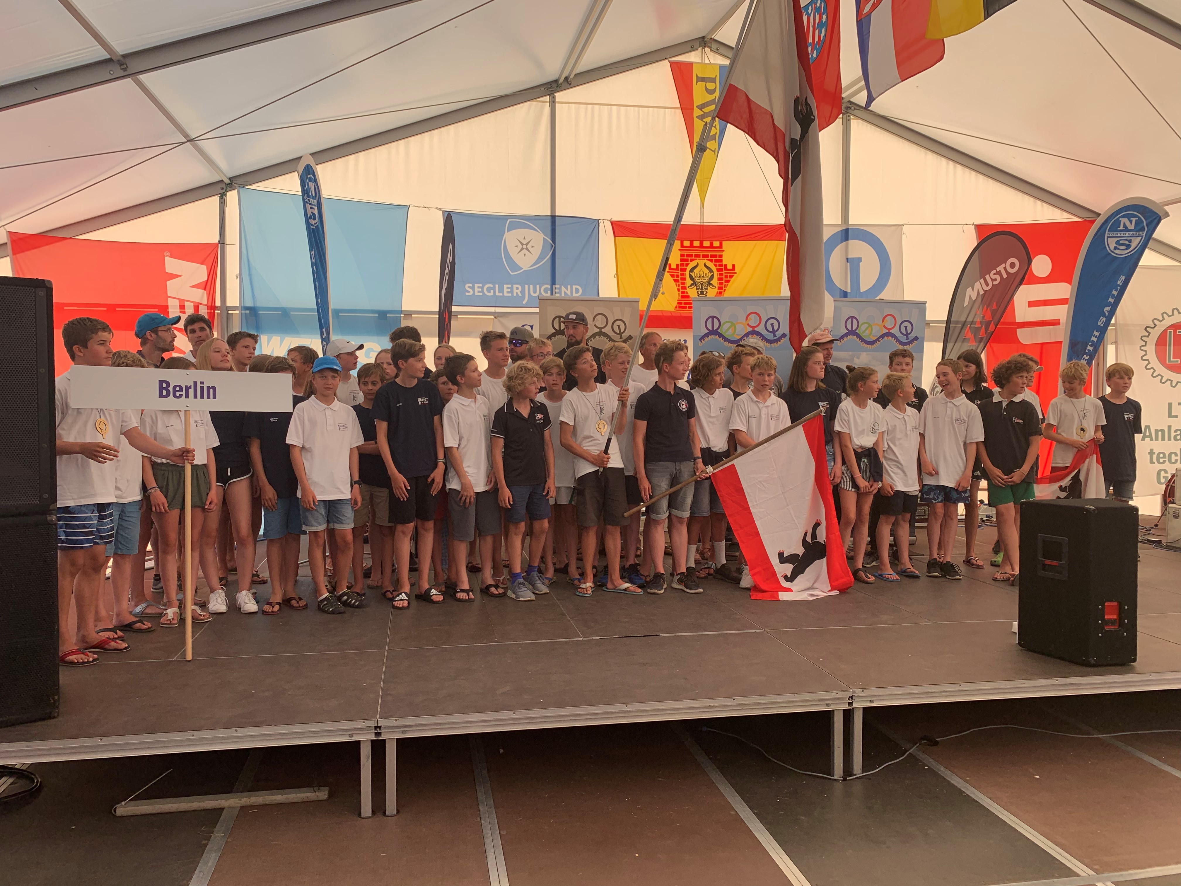 "Nunmehr weht der Clubstander des PYC auch bei der IDJÜM in Plau am See, die am Samstag Abend eröffnet wurde. Das Bundesland Berlin stellt mit 43 Teilnehmerinnen und Teilnehmern die stärkste Mannschaft von insgesamt 201 gemeldeten Teilnehmern und der PYC ist durch Eddy von Bülow, Clara Held, Romeo Grobe, Moritz Peschke, Leonie Böcker, Samuel Tolkemit, Olav Hamel, Paul Kühling, Mathilde Blaurock, Annabelle Knoop und Paula Lepa stark vertreten. Als ersten Berliner Erfolg haben "die rasenden Schreddernudeln" am Samstag die German Open im Team Cup Segeln gewonnen. Die Mannschaft setzte sich aus Seglern des Berliner Landeskader zusammen und Eddy war hier für den PYC am Start (Foto auf der DODV Seite). Am Montag sollten die Wettkämpfe starten, wurden aber um 14:00 mangels Wind für erstmal abgesagt. Morgen geht es weiter."