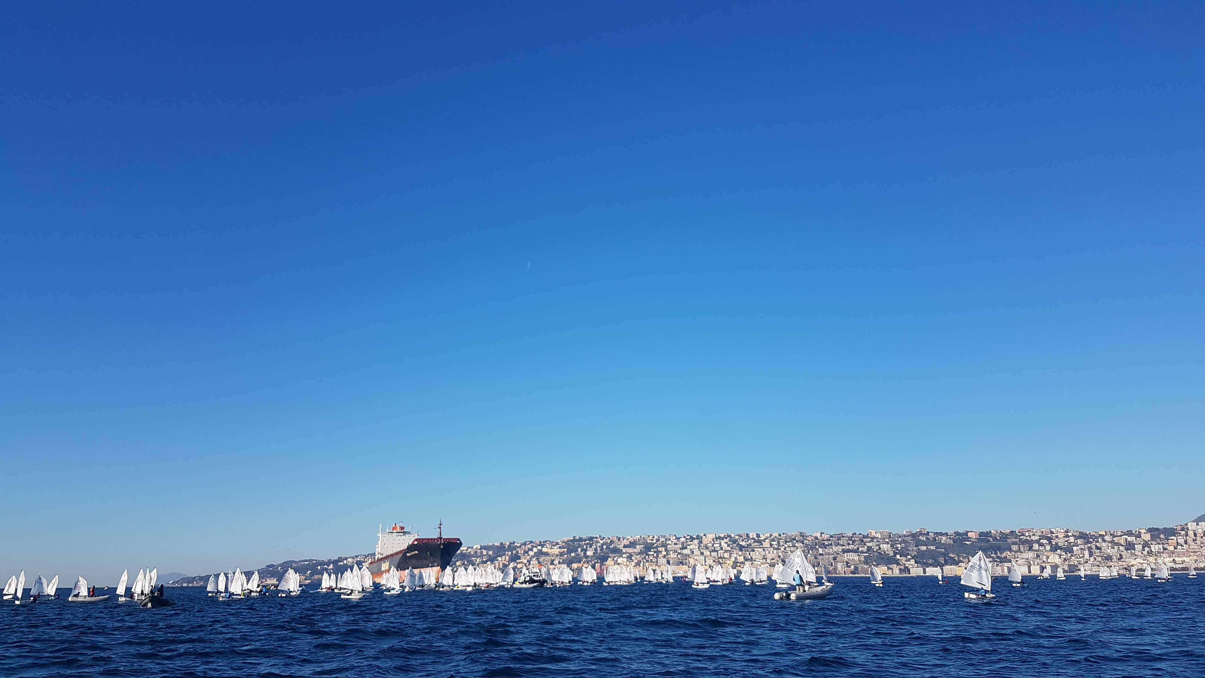 Regattabeginn - Nach dem Frühstück in Segelsachen sollte heute unser erster Regattatag sein. Zunächst wurde die Regatta offiziell und feierlich eröffnet. Dabei wurde die italienische Hymne gesungen und die Nationalflagge sowie die Clubflagge gehisst. Das Regattafeld der Juniores war 180 Segler*Innen stark. Insgesamt nahmen mehr als 10 Nationen teil. Acht Wettfahrten wurden ausgeschrieben. Im Anschluss bauten wir die Boote auf, schauten nach unseren Fleets, in denen wir segeln sollten und legten schließlich ab. Ohne eine Wettfahrt gesegelt zu sein, legten wir nach drei bis vier Stunden des Wartens im Golf von Neapel unverrichteter Dinge wieder an. Es war einfach zu wenig Wind. Abends gab es dann Dinner im Club mit allen teilnehmenden Teams.