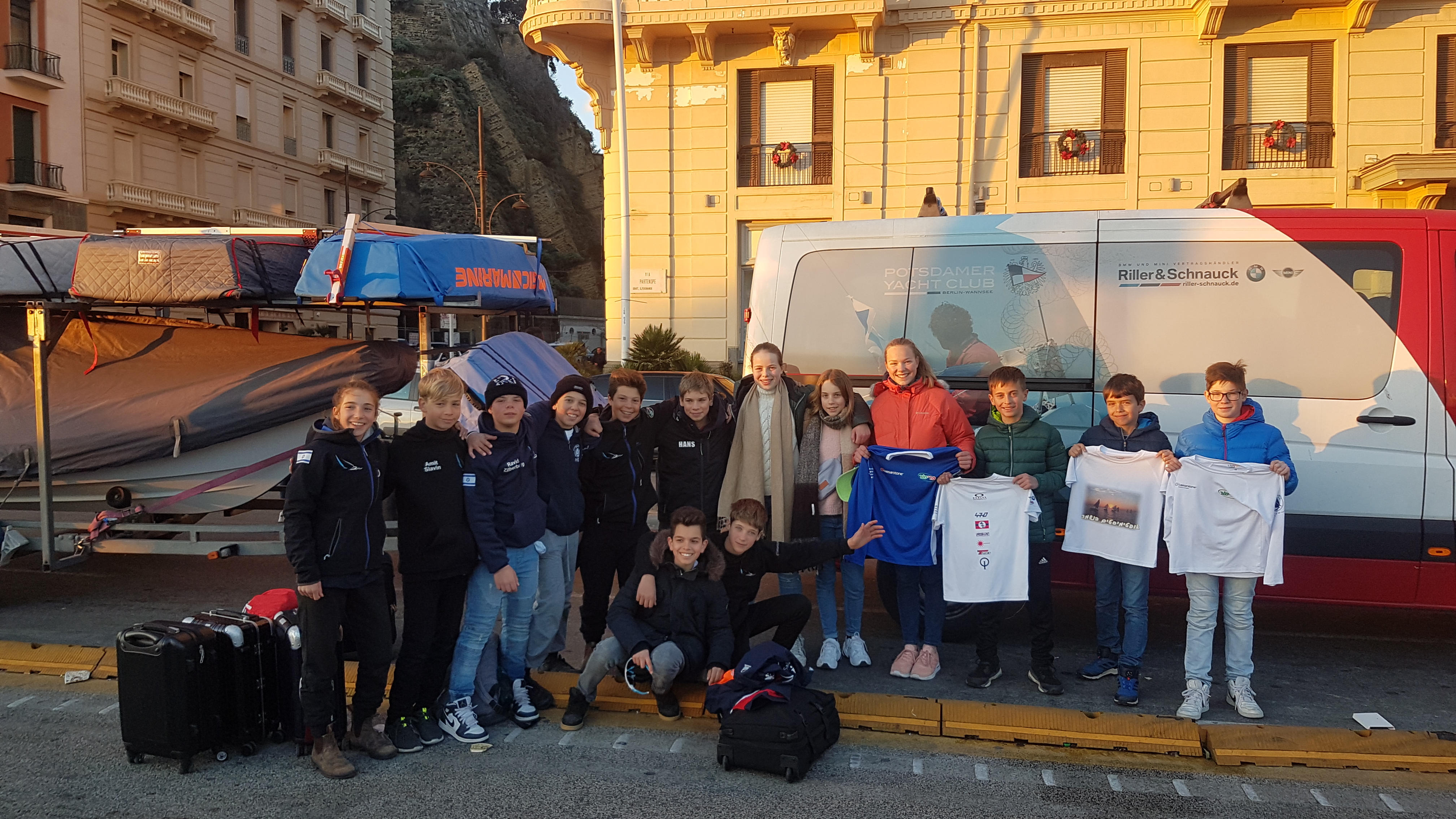 Der Wind, der an den ersten beiden Regattatage fehlte, sollte sich heute zeigen. Morgens vor dem Frühstück machten wir uns schon für die Abreise bereit, weil ja heute auch unser letzter Tag in Neapel war. Im Club angekommen, waren wir etwas verwundert, dass uns die Startverschiebung auf 09.30 Uhr offenbar entgangen war. Innerhalb von 5 Minuten waren wir ablegebereit und schafften es pünktlich zum Start. Es wurden wieder nur zwei Wettfahrten gesegelt, allerdings dieses mal, weil wir zuviel Wind hatten. Mit 40 Knoten Wind waren wir seglerisch stark gefordert. Nach Abbruch mussten wir direkt in den Hafen segeln, was bei dem Wind und der sich zunehmend aufbauenden Welle gar nicht so einfach war. Am Ende der Regatta wurden dann insgesamt vier Wettfahrten gewertet. Anschließend ging es direkt an das Verladen der Boote, das aus Platzgründen dann mehr oder weniger auf der Strasse stattfinden musste. Bevor es zum Flughafen ging, schenkten uns die israelischen Segler noch T-Shirts und wir luden sie zum nächsten Opti TeamRace nach Berlin im Oktober 2020 ein.Um 23.30 Uhr landeten wir dann wieder wohlbehalten in Berlin.