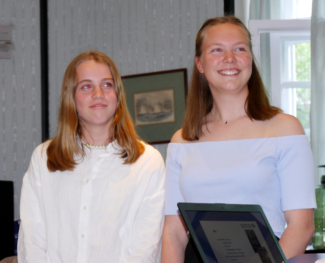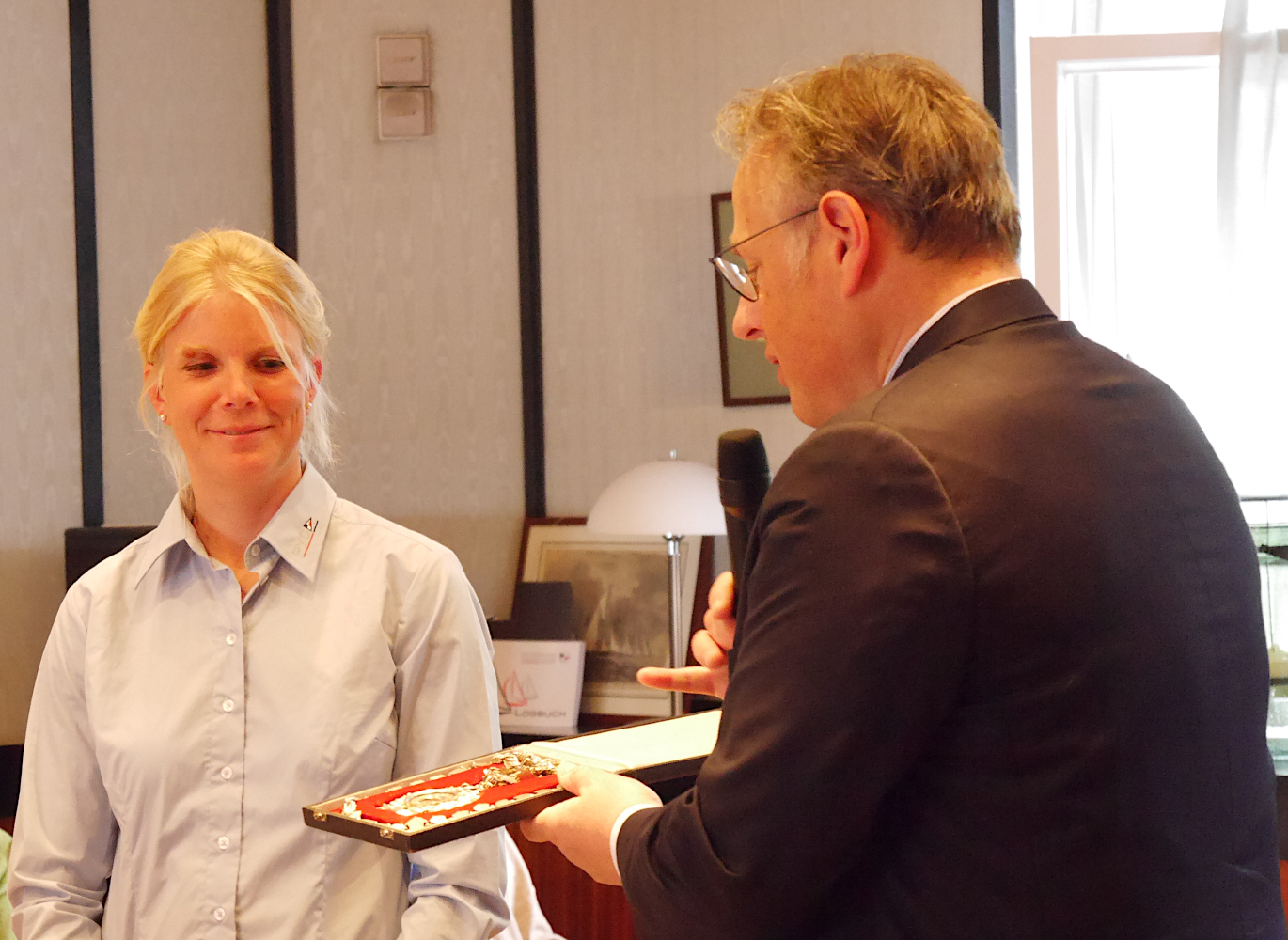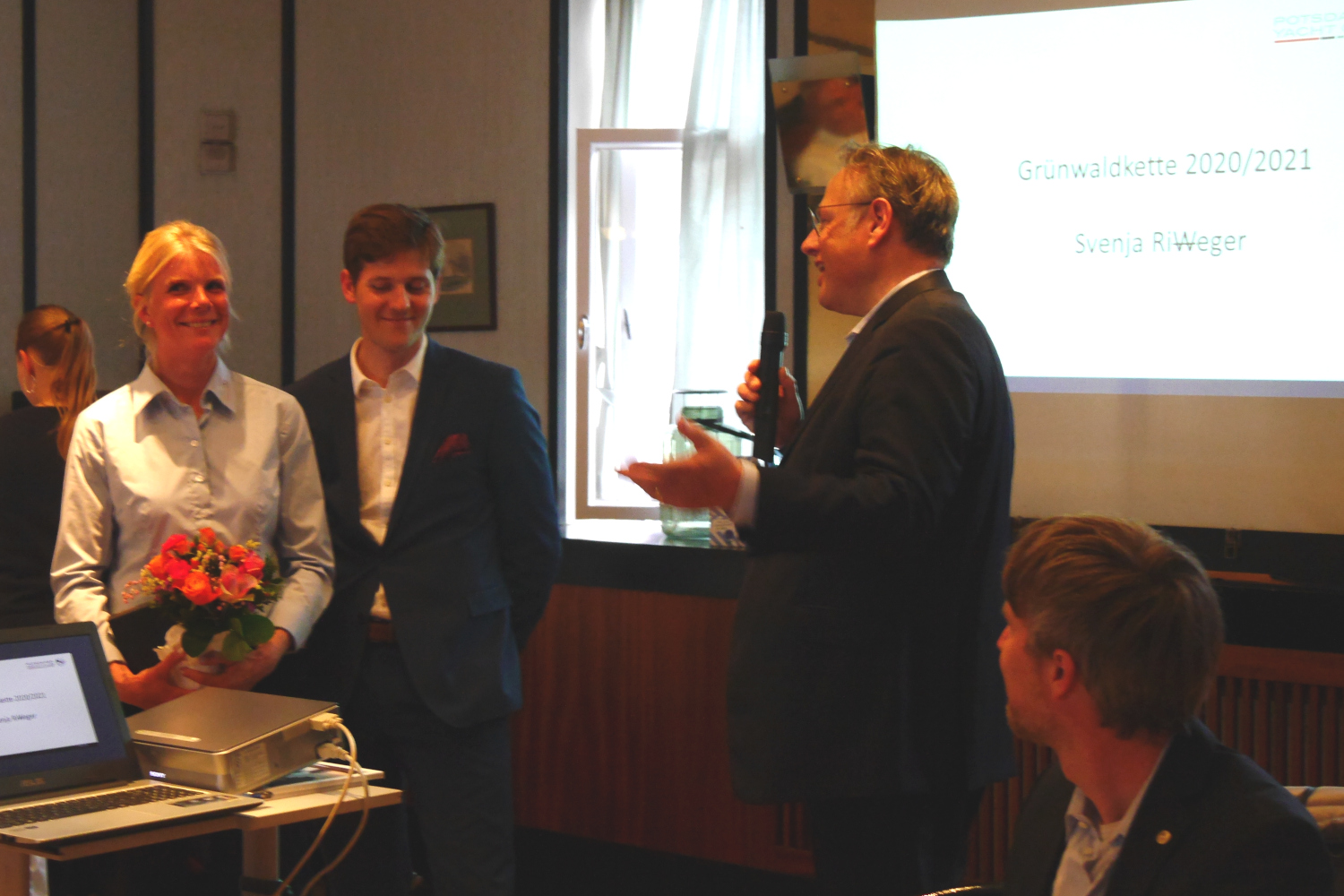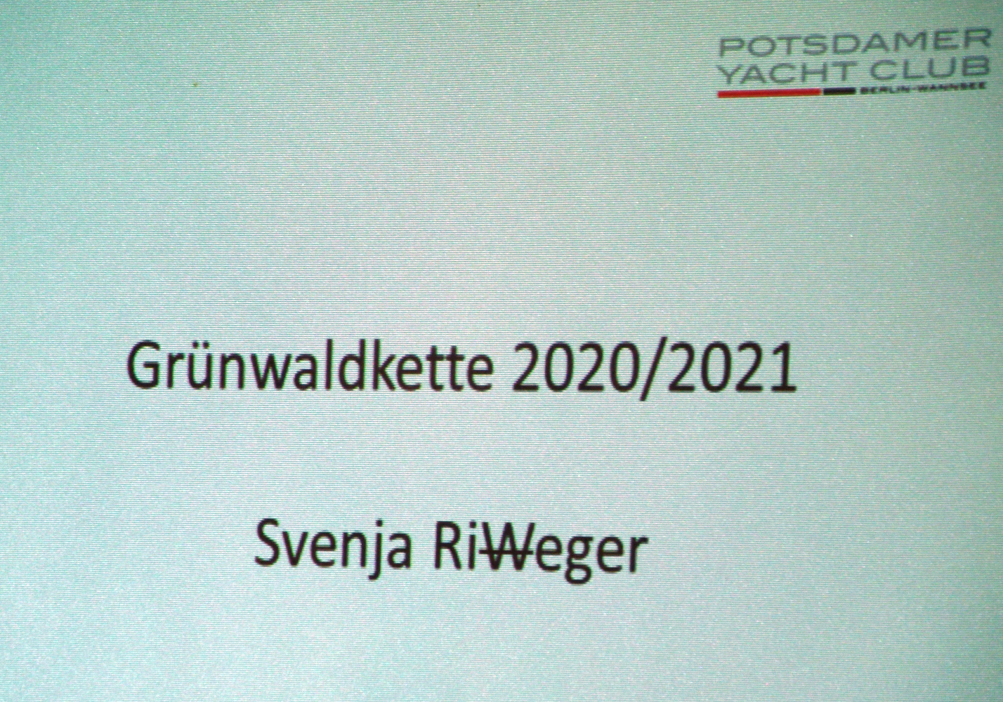 Den Anfang machte unsere Olympiateilnehmerin Svenja Rieger (geb. Weger). Hartmut Papenthin, der ihren Werdegang über etliche Jahre als Jugendobmann begleitet hatte, konnte ihr nicht nur die Georg-Grünwald-Kette als Auszeichnung für die beste Regattaseglerin im Club überreichen, sondern obendrein zur wenige Stunden zuvor erfolgten Eheschließung gratulieren!