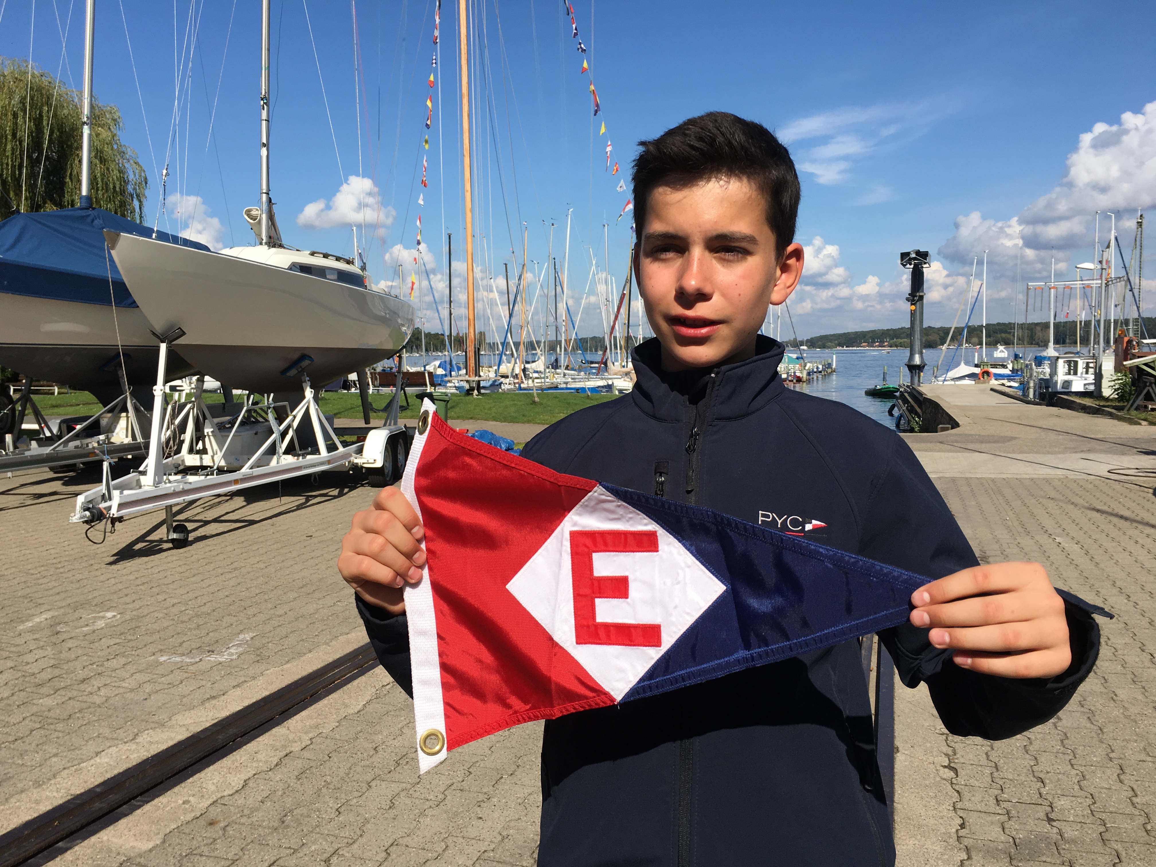 Freunde im Nordwesten der USA- 1940 wurde der Eugene Yacht Club am Stausee Fern Ridge Lake (36,4 km²) gegründet, 20 Autominuten von Eugene (160.000 Einwohner), der bedeutendsten Universitätsstadt des Bundesstaats Oregon, entfernt. Etwa eine weitere Stunde Richtung Westen liegt der Pazifik, eine gute Stunde Richtung Osten bringt einen ins nächste Skigebiet in den Cascades. Der EYC ist ebenso bunt gemischt, wie man es aufgrund des Rufs Eugenes als Hippie-Hauptstadt der USA erwarten würde. Die wöchentlichen Regatten reichen vom entspannten “beer can race“ am Dienstagabend über die Jollenregatten am Mittwoch bis zur Clubregatta am Donnerstag, die nach Bootsklassen sortiert gestartet wird. Auch nationale Wettbewerbe werden ausgetragen – bis das U.S. Army Corps of Engineers in desen Tagen (und immer jährlich im November) wieder den „Stöpsel“ zieht. Sigrun Putjenter hat uns von der letzten Reise einen Stander des EYC mitgebracht. Vielen Dank! Auf dem Bild stolz präsentiert vom jüngsten 4.7 Lasersegler, den der PYC im Moment in seinen Reihen hat, Hendrik Putjenter.