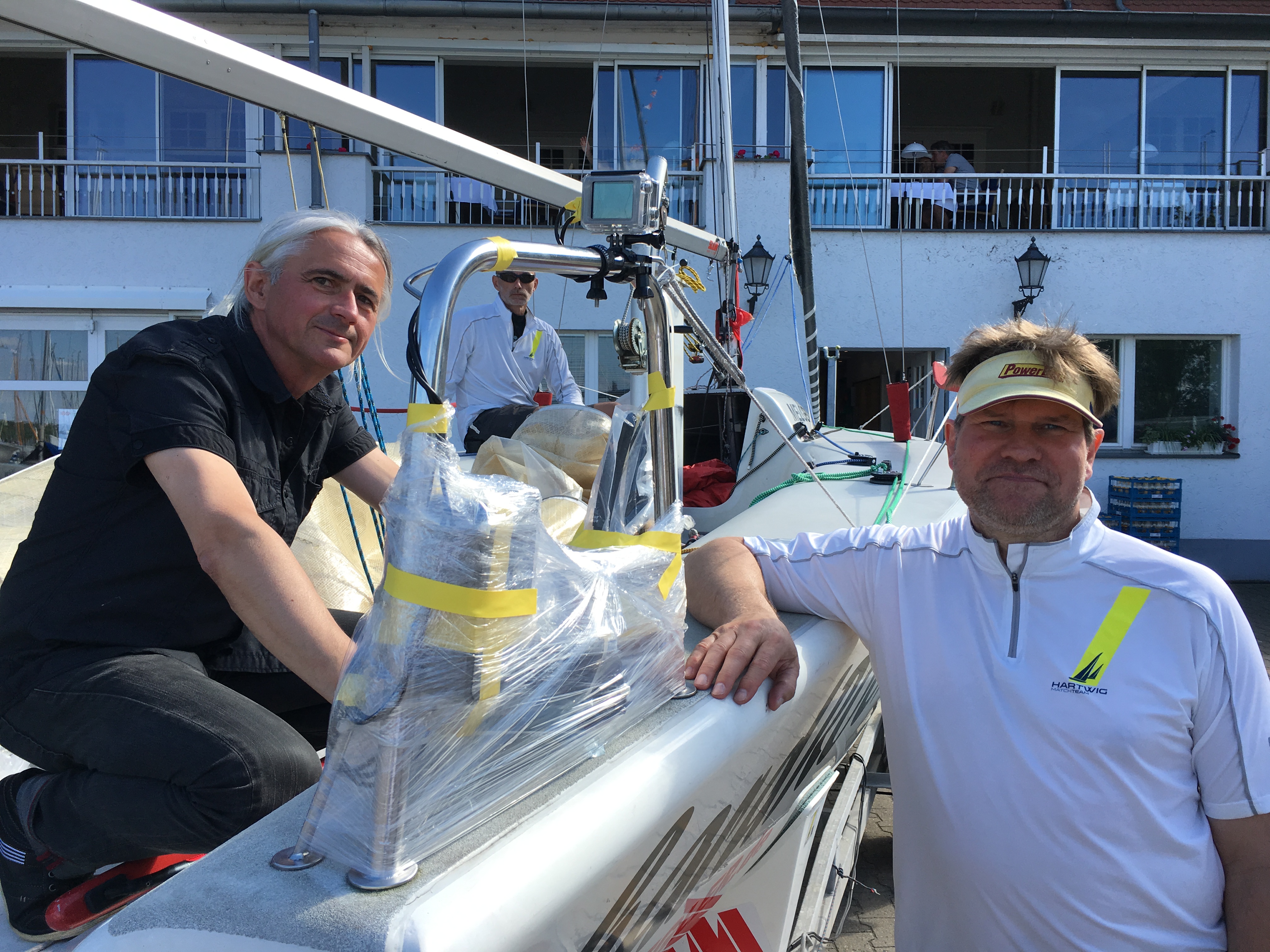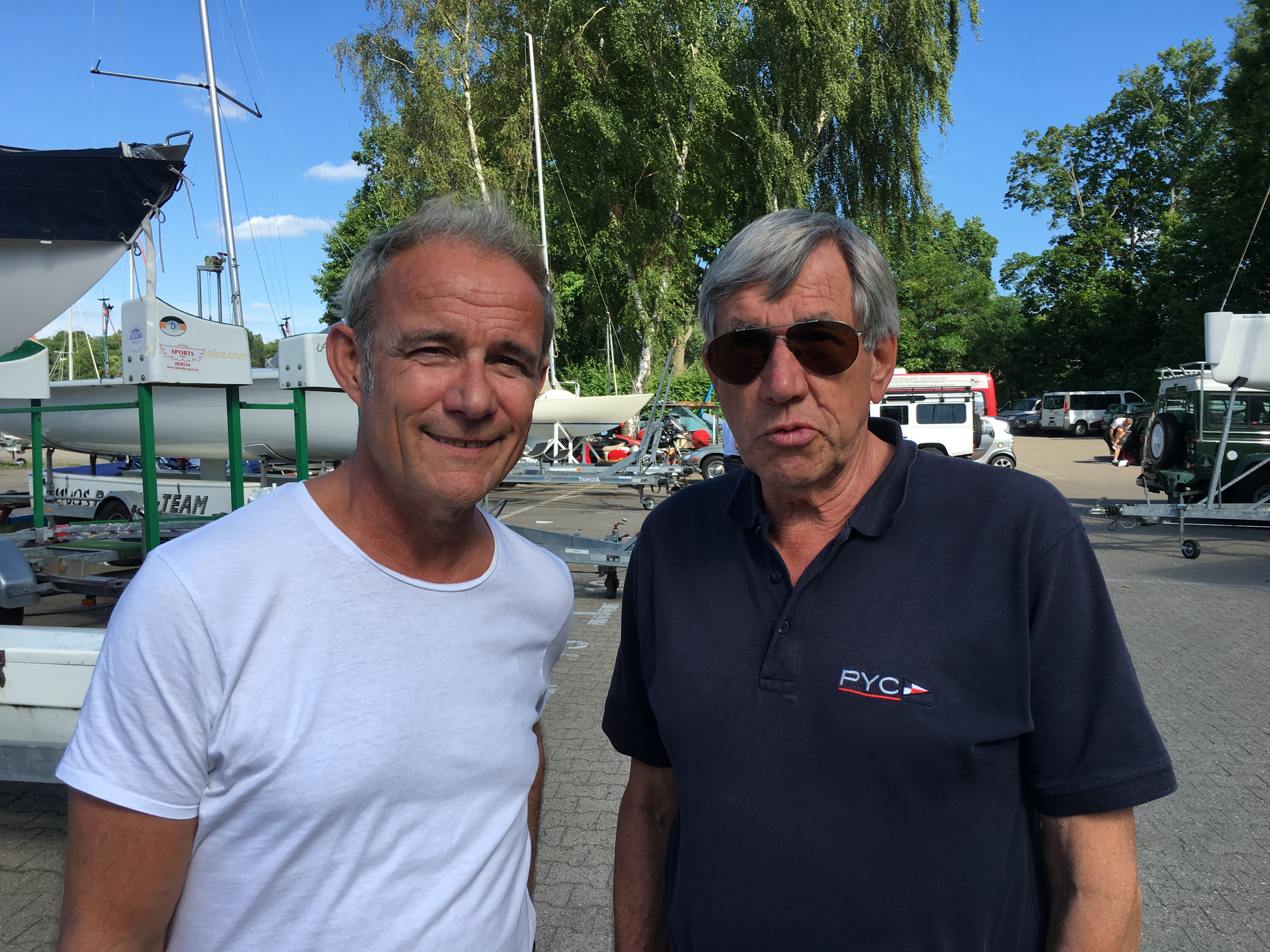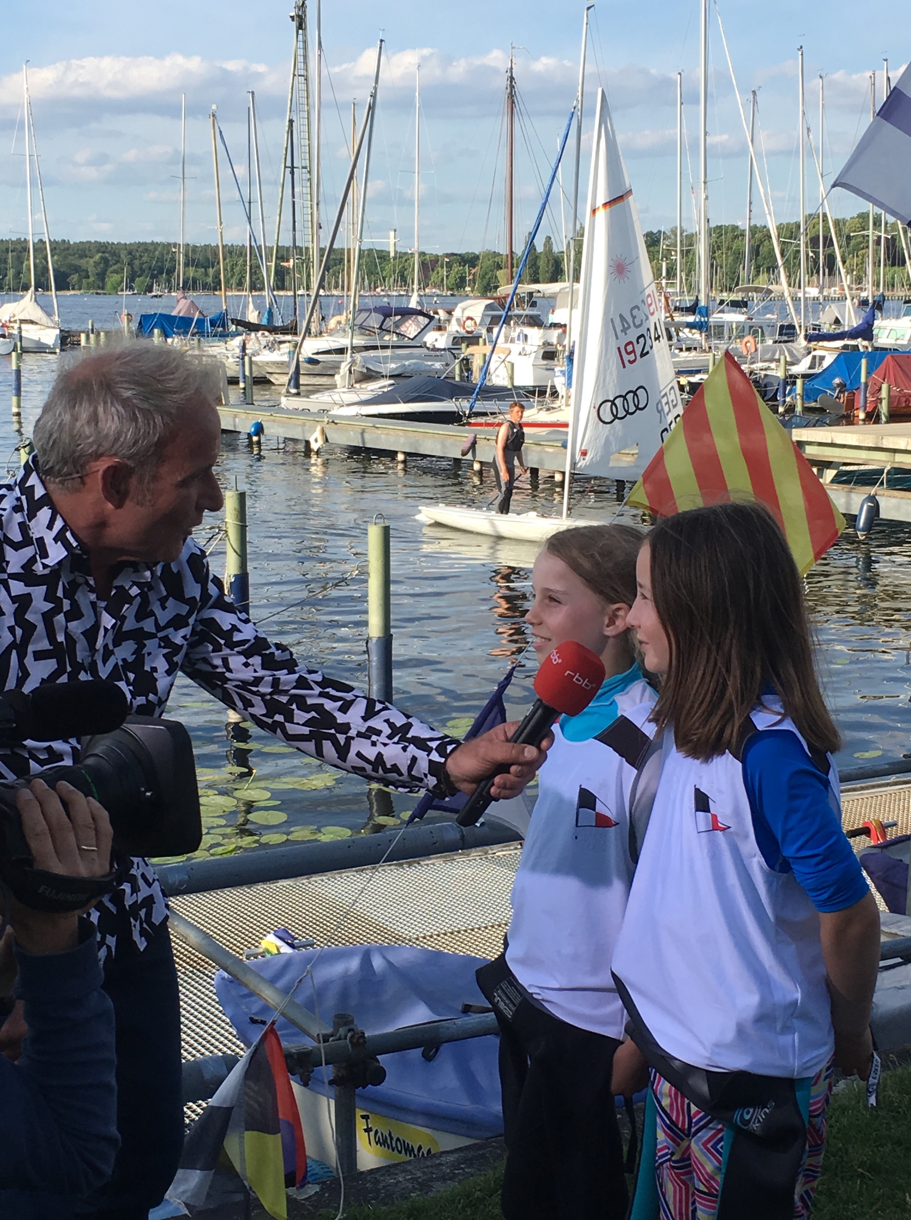 Bereits um 14h rollten die Ü- Wagen auf den Hof und die vielen Mitarbeiter des rbb begannen mit den Vorbereitungen der Livesendung. Viele Kameraeinstellungen wurden ausprobiert, Marika und Leonie interviewed sowie der Wettfahrtleiter bei den Vorbereitungen der Wettfahrt gefilmt. Denn Schwerpunkt waren Berichte vom Jubiläumscup, den Wettfahrtleiter Norbert Dreifürst gemeinsam mit dem BYC und dem VSaW in diesem Jahr veranstaltet. Zum letzten Lauf des Jubiläumscup traten dann über 70 Boote aus den drei Clubs zu einem spannenden Finale insbesondere zwischen Thomas Metzing (Folkeboot) und Jens Hartwig (Melges 24) an. Am Ende behielt Jens bei Leichtwindbedingungen die Nase vorn und freute sich über den Gewinn der Jubiläumsregatta 2017. Herzlichen Glückwunsch! Unser Dank geht an Reporter Andreas Ullrich, Redakteurin Carola Meyer und das nette Team vom rbb, unserer Gastronomie sowie allen helfenden Händen aus dem PYC.