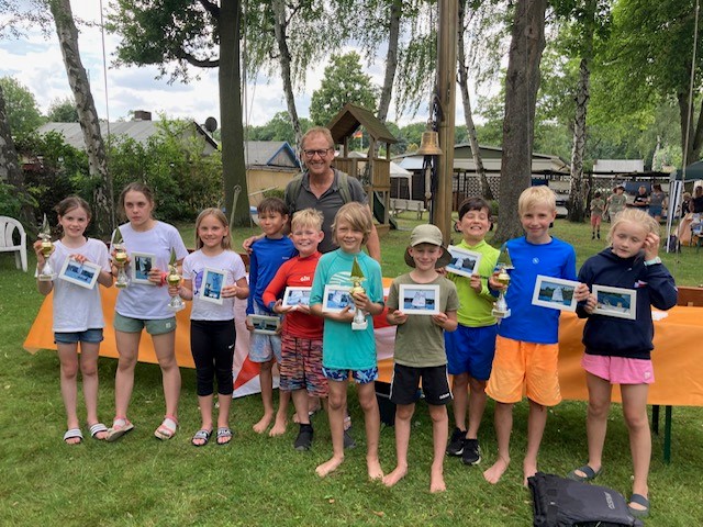 Insgesamt nahmen 24 Segler*innen aus Berlin teil. Davon kamen elf Kinder aus unserem Club. Trotz schlechter Windprognose konnten am Samstag bei mäßigem und stark drehendem Wind immerhin drei Wettfahrten durchgeführt werden. Anschließend wurden wir mit einem Grillfest und einer großen Tombola belohnt.