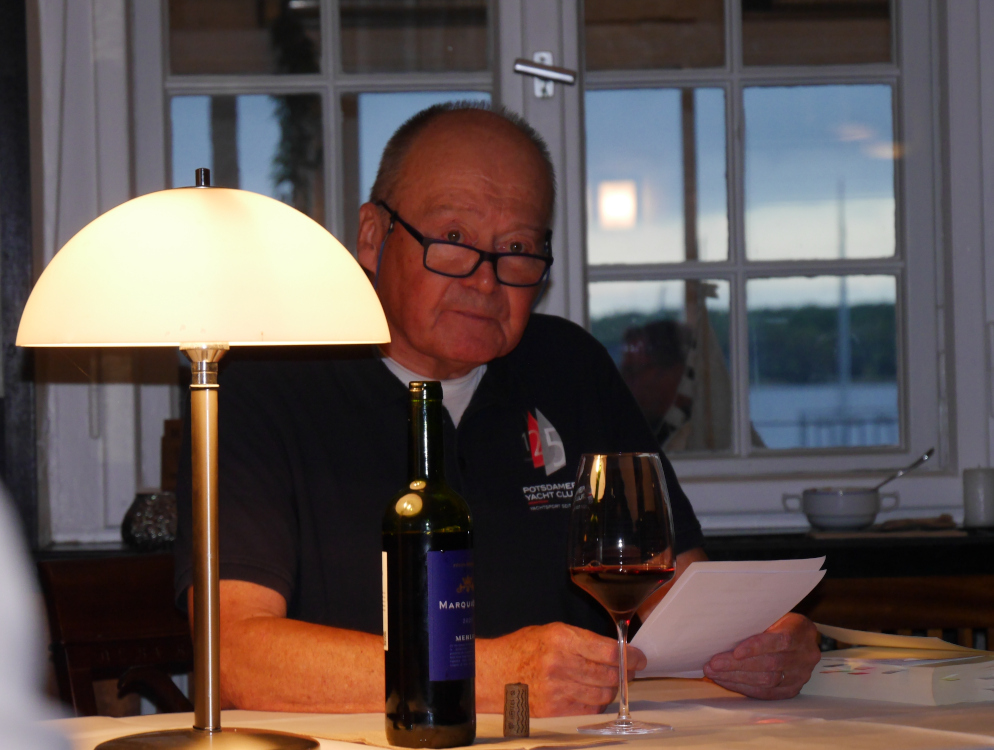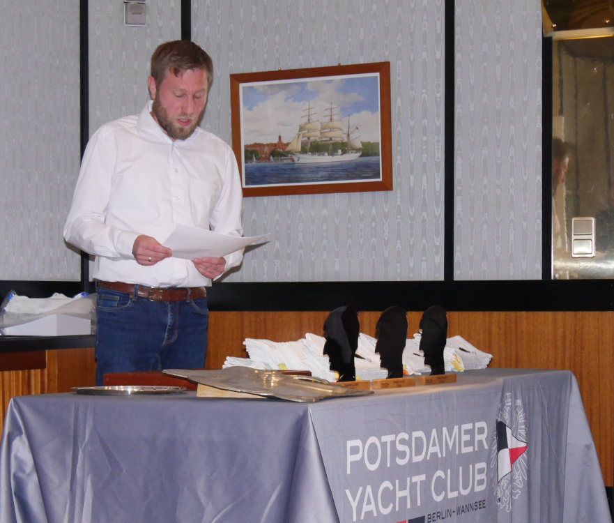 Nach Chili con Carne mit Freigetränken gab es im Saal die Lesung zu Ringelnatz, anschließend konnte die Siegerehrung starten. Schnellstes gesegeltes Schiff war die Melges 32 mit Skipper Thomas Köbbert aus dem VSaW. Aus dem gleichen Club kam auch das schnellste gesegelte Schiff nach berechneter Zeit: ein 22er Schärenkreuzer mit Christian Schneider an der Pinne. Die Teamwertung hat der Spandauer Yacht Club mit Gunner Perlitz, Robert Kühns und Dimitri Rempen gewonnen, leider war kein Teammitglied zur Übergabe der Wander- und Sachpreise anwesend. Der PYC stellte mit 7 Teams das größte Feld und drei Mannschaften waren am Ende unter den Top Ten vertreten: Platz 4: Team PYC 3 (Fidibus, Ruckzuck, Start-up), Platz 6: Team PYC 2 (Pegasus, Aquavite, Magic), Platz 9: Team PYC 1 (Sweet Sixteen, Mezzanotte, hardRock).