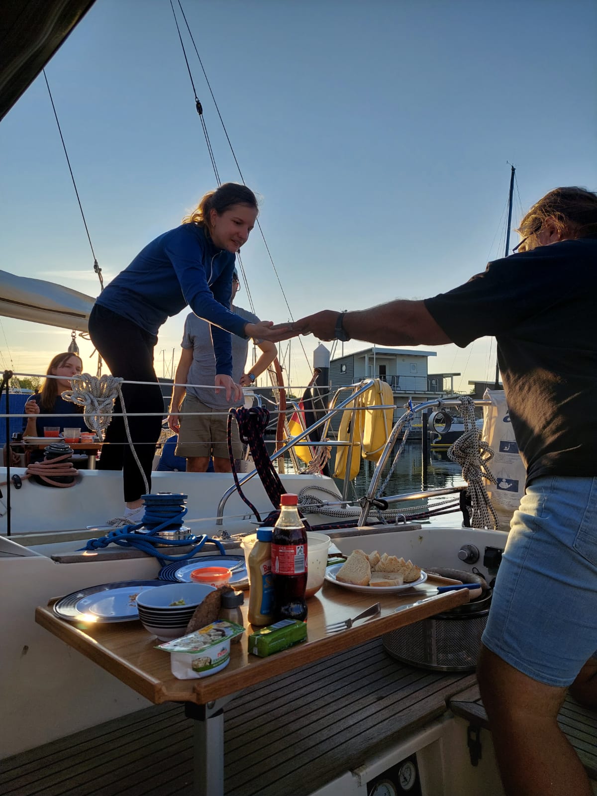 Am nächsten Morgen ging es weiter in Richtung Schwedt. Im Schiffshebewerk Niederfinow waren wir, nach nur 20 Minuten Wartezeit, alleine. Der Weg bis zur Hohensaatener Schleuse verlief ohne besondere Vorkommnisse. Während wir am Haltepunkt für Sportboote festmachten, rief aus dem Lautsprecher ein etwas rüder Schleusenwart, wir müssten auf dem Knopf drücken, wenn die Schleuse geöffnet werden soll. Etwas verwirrt, wir waren ja noch nicht soweit, fragten wir nach, ob wir jetzt trotzdem noch den Knopf drücken sollen. Er hatte uns da offensichtlich bemerkt. Nein, aber wir sollten vorfahren, war die Antwort. Also lösten wir die Leine wieder und fuhren vor die Schleuse. „Jetzt muss ich aber mal schimpfen! Wie wollen Sie denn vor der Schleuse die Ampel sehen?" rief es unwirsch aus dem Lautsprecher. ???? auf unseren Gesichtern. Also wieder ran an die Haltestelle und, kaum festgemacht, sprang die Ampel auf Grün. Ein Glück waren wir als Crew gut gelaunt und eingespielt. Nachdem die Schleusentore aufgingen, warteten wir artig auf die grüne Ampel … ??? ... bis die vor der Schleuse wartenden Boote sich anschickten hineinzufahren. Aufgrund des vorherigen Verhaltens des Schleusenwarts fragten wir über Funk an, ob wir rausfahren dürften. „Ach, ist noch nicht Grün? Habe ich wohl die Lichter verwechselt. Fahren Sie bitte vorsichtig raus." Gesagt, getan. In Schwedt angekommen haben wir die halbe Crew, wie geplant, abgesetzt und uns zu zweit am nächsten Tag auf den Weg nach Stettin gemacht. Hans-Joachim hatte uns über WhatsApp mitgeteilt, dass die Leute in der Marina Hotele bei ihm keine gute Arbeit beim Maststellen geleistet haben. Daher entschieden wir uns kurzfristig um und ließen den Mast beim AZS Stettin stellen. Eine gute Entscheidung, da der Bootsmann ein kompetenter Mann ist, hat alles recht schnell und ohne Schäden geklappt.