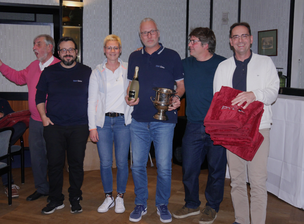 Nach der Verlesung der Platzierungen aller 46 Teilnehmer der Saison 2022 wurde dann auch das Geheimnis des diesjährigen Siegers gelüftet: Nach einer souveränen Serie mit drei 1. und zwei 2. Plätzen bei zehn gesegelten Wettfahrten konnte sich die Crew der Sweet Sixteen um Steuermann Daniel Ebeling den Titel des diesjährigen Clubmeisters vor Familie Fink (Ruckzuck) und Dr. Klaus Hunger mit Crew (Mistral) sichern. Auf den Rängen 4 bis 6 folgten: Lasse Klötzing (Olymp), Jens Hartwig (hardRock) und Bernd Hanisch (Start-Up). Der 12er Pokal ging in diesem Jahr an Norbert Dreifürst und Crew (Snark). Alle Ergebnisse finden Sie hier.