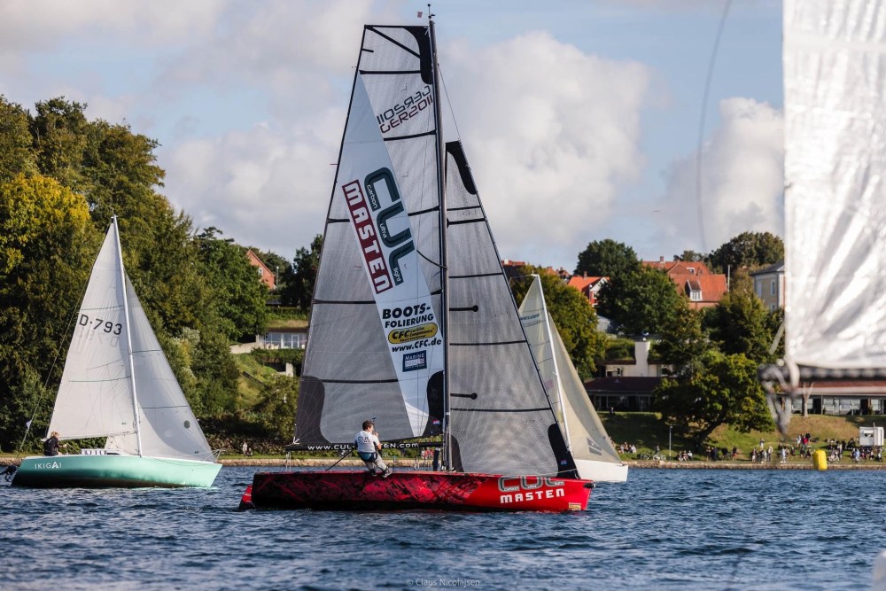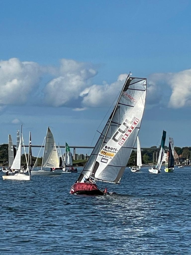 Dann aus dem kleinen Sund rausgekreuzt - weder Echolot noch einen Plotter. Das war echt belastend. Nach links abgebogen und bewusst Zweiter geblieben, weil ich den Weg nicht kannte und im Kielwasser des Ersten geblieben. Da haben die anderen schon ihre Gewichte nach Luv gebracht, ich habe nur geträumt.