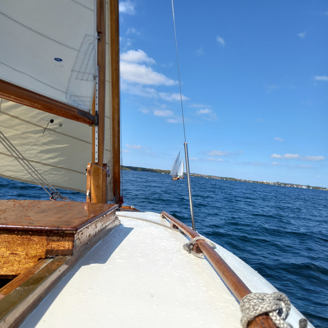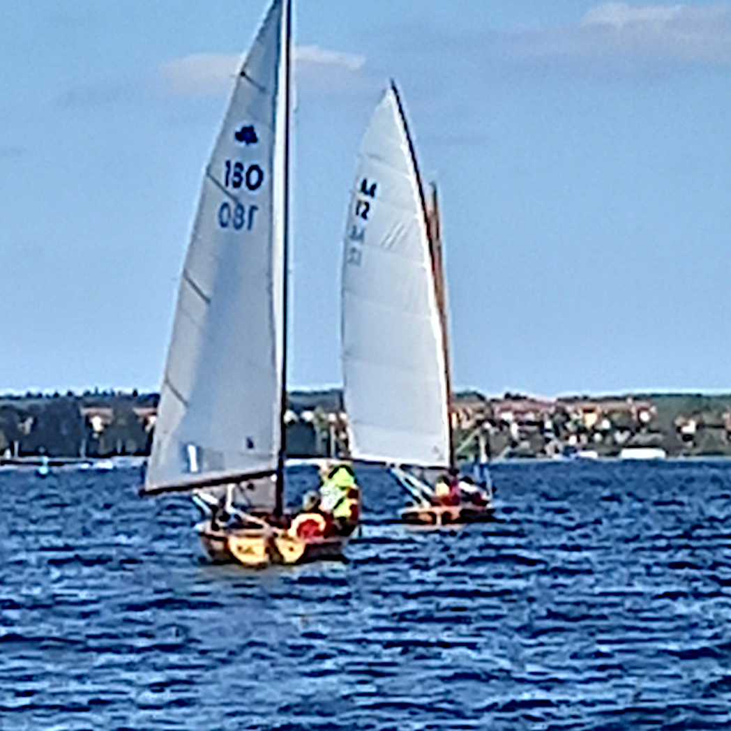 So kamen wir – alles mit 4 PS und gelegtem Mast – im „Eiltempo“ am Samstag, 6.5. bei Rechlin in die Kleine Müritz. Kurz Ankern, Maststellen und dann in rd. 3 ½ Stunden bei rd. 3 Bft raumschots zum Warener Segelverein, wo unsere Freunde ihre Boote auch gerade aufriggten und das Ansegeln im Vereinsheim bei Kaffee und Kuchen in vollem Gange war. In den folgenden Tagen in Flottille mit 15er Rennjolle, Schratz (6m-Jolle vom Chiemsee) , z.T. FD das „kleine Meer“ erkundet. Neben Fahrt zum Eisessen und Kirchturmbesteigung in den Stadthafen Röbel war „Höhepunkt“ mal eben Pommes essen in der Marina Segelverein Rechlin … 3 Std hin, 2 ½ zurück …