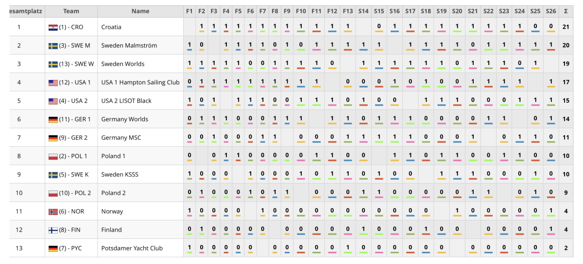 Die kroatische Mannschaft, die letztes Jahr erst im Finale dem Team aus Puerto Rico unterlegen war, ließ sich dieses Jahr auf Ihrem Weg zum Gewinn des großen Wanderpokals nicht beirren und gewann bereits die Qualifikationsrunde, bei welcher jedes Team zweimal gegen alle anderen Teams segelte, souverän. Im großen Finale traf sie dann auf den Zweitplatzierten der Qualifikationsrunde, das schwedische WM-Team. Mit zwei Rennsiegen in Folge konnten sich die Kroaten den Titel sichern, dazu unsere herzliche Gratulation. Im Kleinen Finale zwischen dem US Team vom Hampton Yacht Club und dem schwedischen Team von Emil Malmström benötigten die Amerikaner nach dem Verlust des ersten Rennens zwei weitere Rennen, welche sie beide gewannen, um sich den dritten Platz zu sichern.