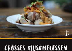 Mit Föhrer und Sylter Miesmuscheln in Tomaten-Weißweinsauce, Baguette.